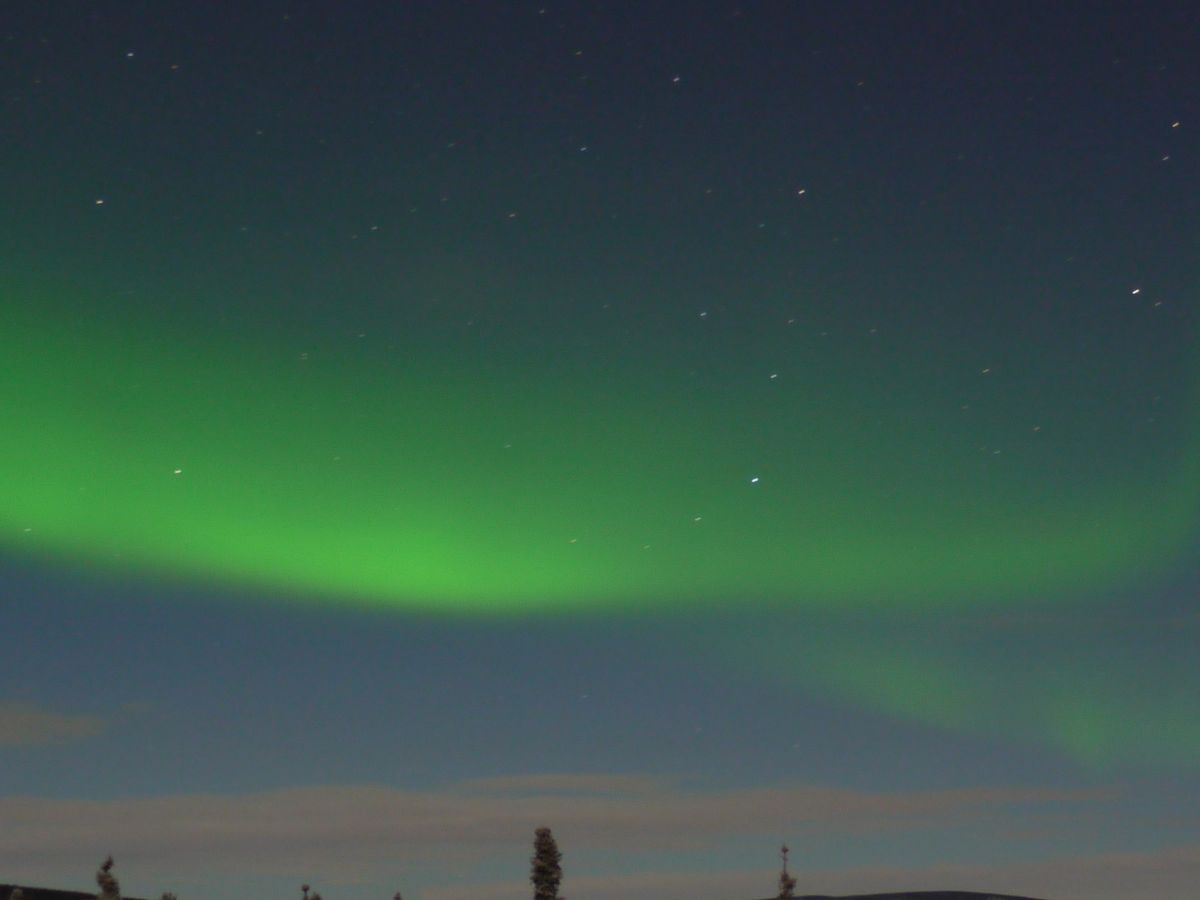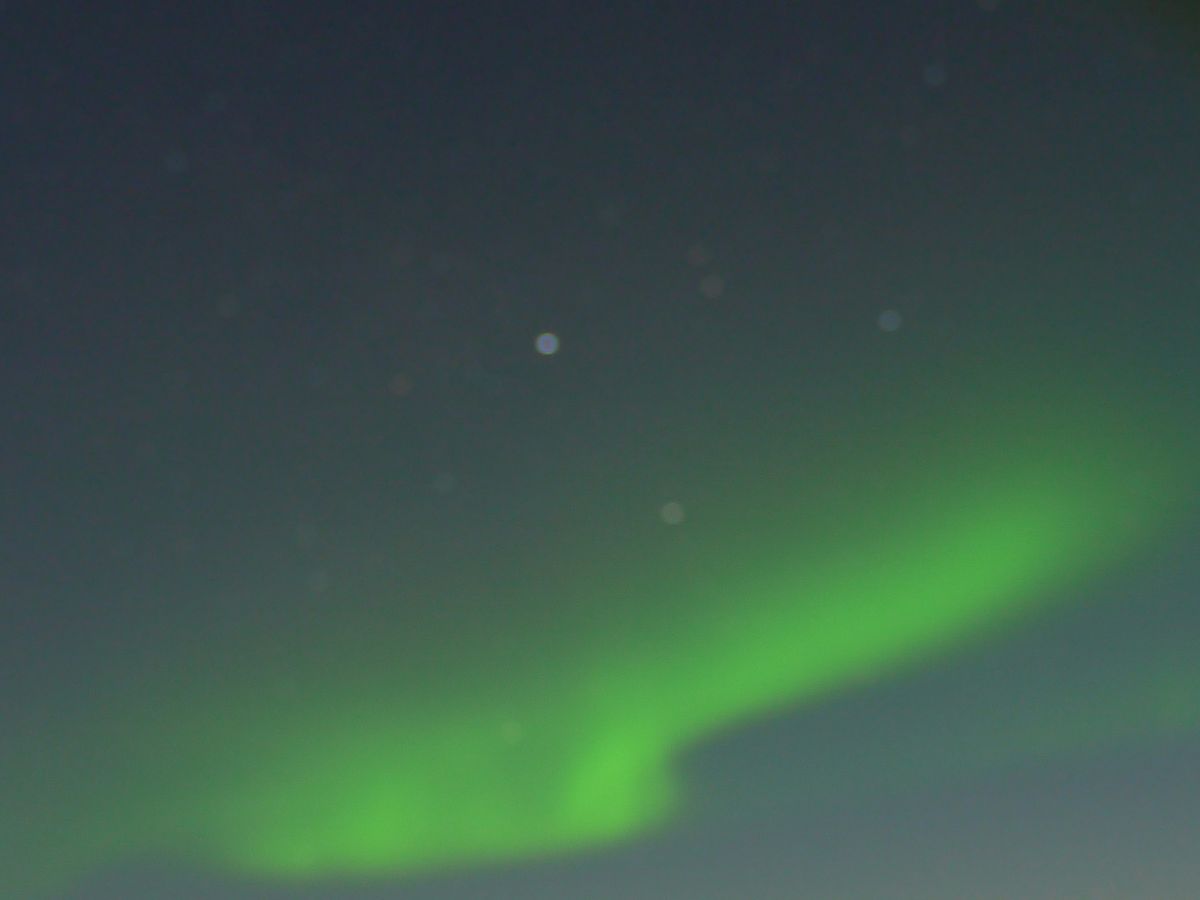 28日の夜(実際は29日未明)、幅の広い雲が天の川のように流れているのが見えました。白い雲でしたから、まさかオーロラとは思いませんでしたが、山小屋の主人である河内牧栄に「オーロラです」と言われ、慌ててカメラで撮影しました。肉眼では白でも、カメラで撮ると、確かに緑色に見えます。前日(27日)は見られなかったそうですから、ラッキーでした。