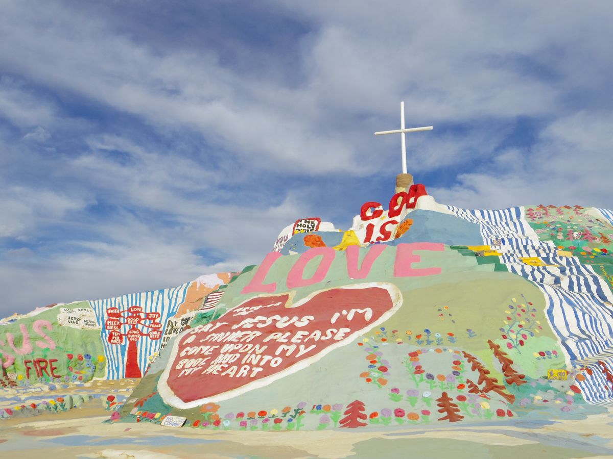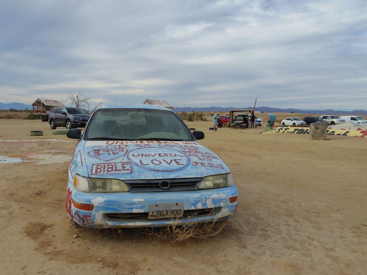 お次はサルベーションマウンテンへ。砂漠のなかでいきなりカラフルな小山が!圧巻のアート作品でした。黄色に塗ってあるところ以外歩いてはいけないのですが、写真撮影に夢中になってる方々が管理人さんから注意されていました。サルベーションマウンテンを作った方はお亡くなりになり、今はボランティア?の方々が補修して維持してるそうなので、ルールは守って大事にしたいですね!とにかく、すごい作品でした!