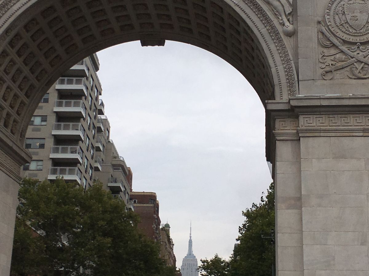 この後、5番街を南に下がり、フリッツ コレクション、プラザホテル、Apple Store、トランプタワー、UNIQLOなどや有名ブランド店を見ながらタイムズスクエアへ、ブロードウェイ劇場街を見つつ、ニューヨーク市立図書館、エンパイヤー・ステートビルディング、スパイダーマンに出てくるフラットアイアインビルを見ながらワシントンスクエアパークへ、ここで下車して散策、エンパイヤステートビルディングを門のアーチ内に見えるスポットを教えていただき、記念の写真を撮影しました。