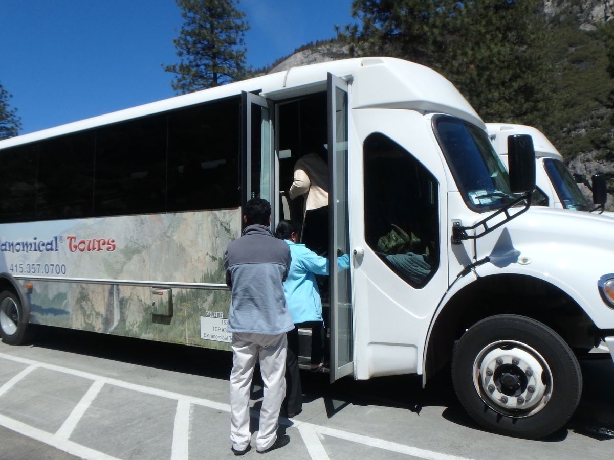 おそらく15分程度待ったかと思いますが、バスの運転手兼ガイドのお兄さんがナイスガイで、ヨセミテの地形について地質の知識なども交えて説明してくれたり、サンフランシスコの歴史や家賃事情なども話してくれた(All in Englishでしたが) ので、一人旅でも全く飽きませんでした。