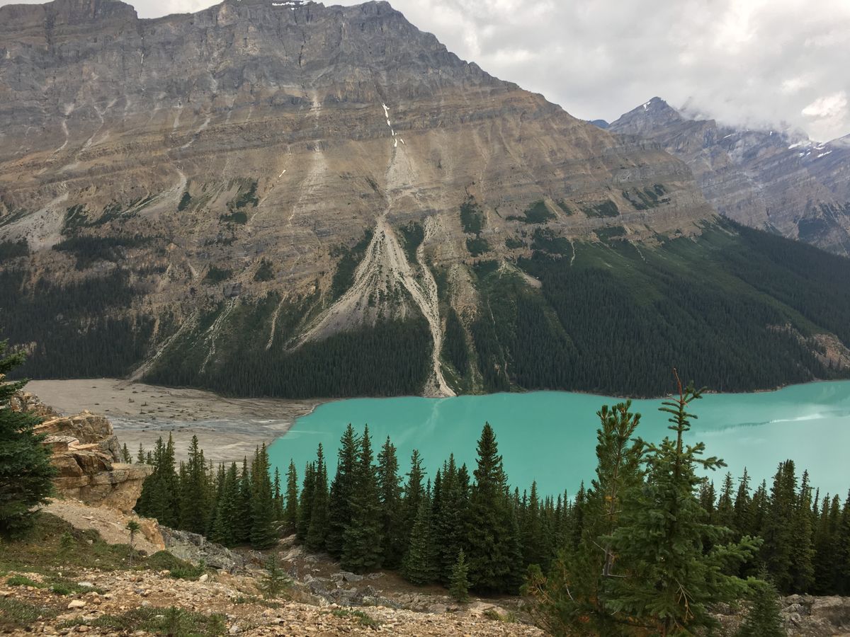 朝からお天気があまり良くなく曇り空でしたが、雨も降らずペイトー湖の景色を眺めておにぎりを食べられました。曇り空でもペイトー湖のブルーは変わらず美しく、大満足です。