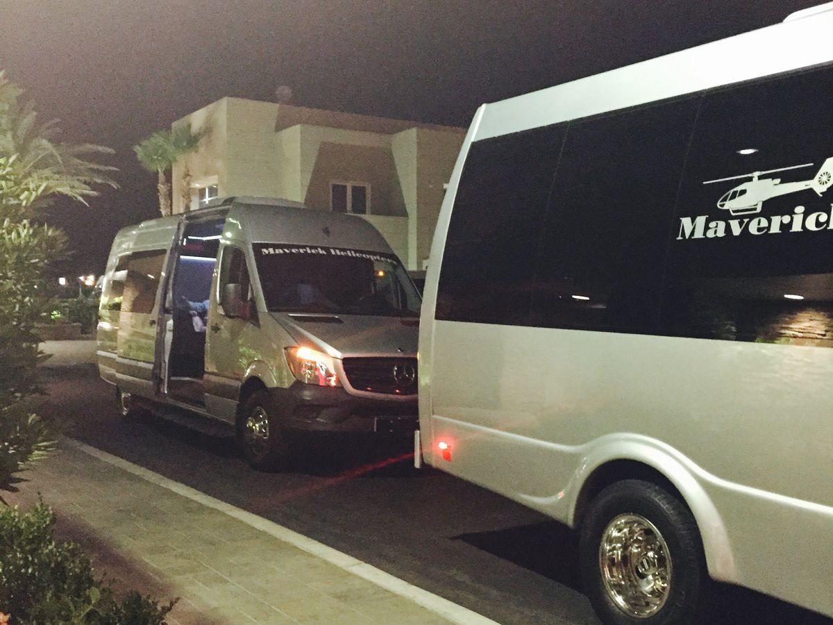 前日に予約して、当日にホテルのコンシェルジュにお願いして、再確認の電話を入れてもらいました。大きなホテルでしたので、送迎の車とちゃんと待ち合わせできるかが心配でしたが、大丈夫でした。心配でしたら再確認の電話の時にコンシェルジュに集合場所を確認してもらうといいかもしれません。10分前に集合場所に行ったら、ドライバーがいました。車は灰色?のワゴンで窓の所にヘリコプターの絵、Maverickの文字があります。シャンパンは積極的にもらいに行ってください。運よく前の席の真ん中に乗る事が出来ました。やはり後ろより前、右より左だと思います。飛行は楽しい分短く感じました。写真を買いましたが約20ドルです。飛行が終わったら建物の外に出て送りの確認をドライバーに
