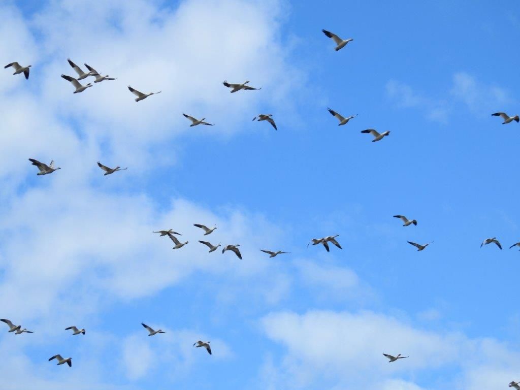 ピックアップしてもらうとすぐ、ハクガンが飛んで移動するのに出会いました。早速ハクガンの追跡です。出発したばかりにライフェル野鳥保護区に逆戻り。遠くの畑に降りたところを確認。何とか近くに行けないかと畑の中の道を走ってもらうと別の群れがいる畑を発見。観察・撮影していると何かに驚いたのか一斉に飛び立ちこちらにやって来るではありませんか。多くのハクガンが頭上を飛んでいく姿は圧巻でした。タクシーではこうはいきません。その後もハクトウワシの営巣している所やハイイロチュウヒ、コヨーテなどを観察することができました。こちらの希望通り車を走らせていただいたおかげだと思います。