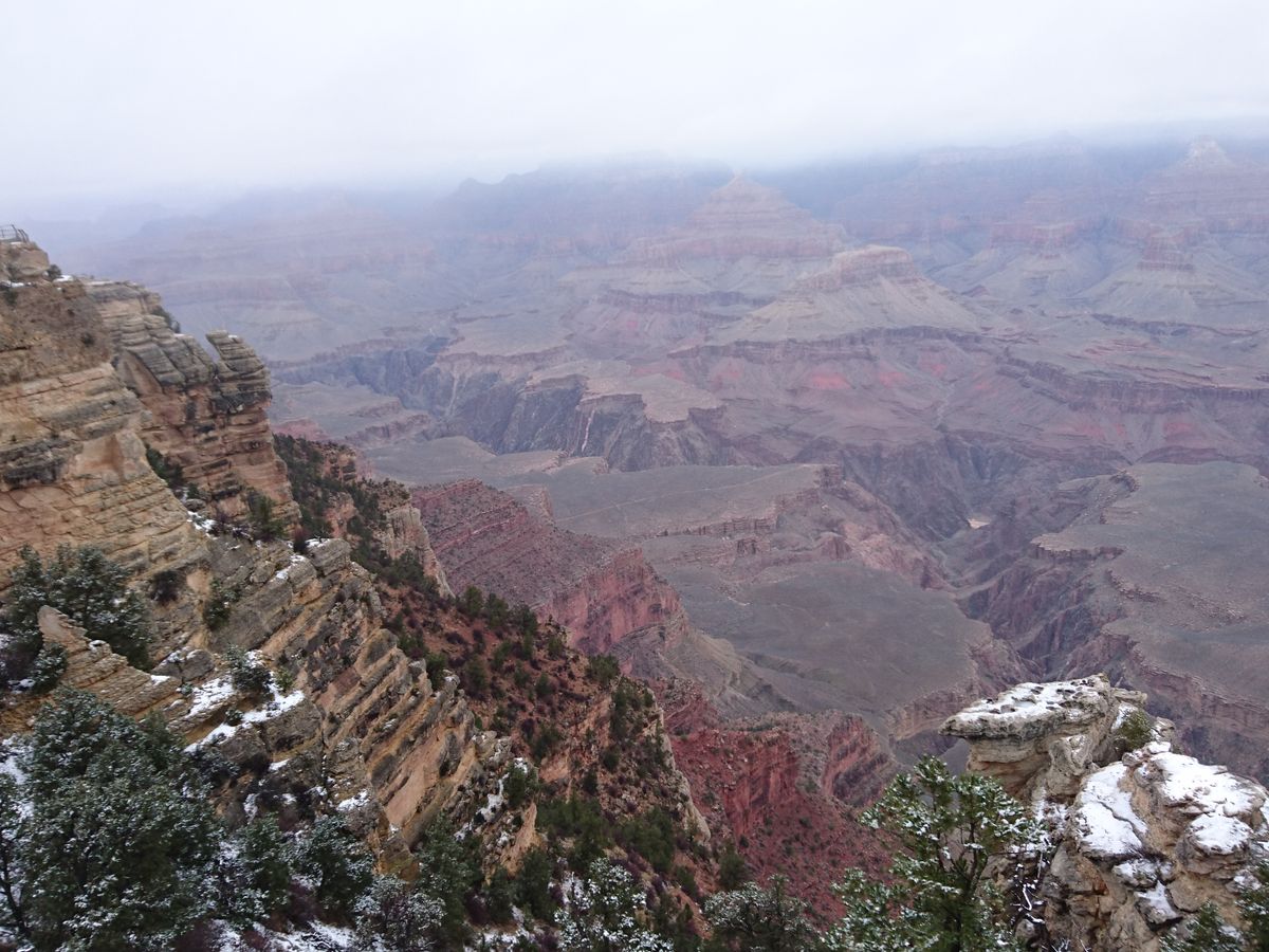 グランドキャニオンに近づくにつれて雲行きが怪しくなってきて、国立公園内に入ると猛吹雪でした。さらに3か所すべてのポイントに到着するごとに、そこは…霧で何も見えない状態でした。妻は初めてのグランドキャニオンだったので残念そうでした。