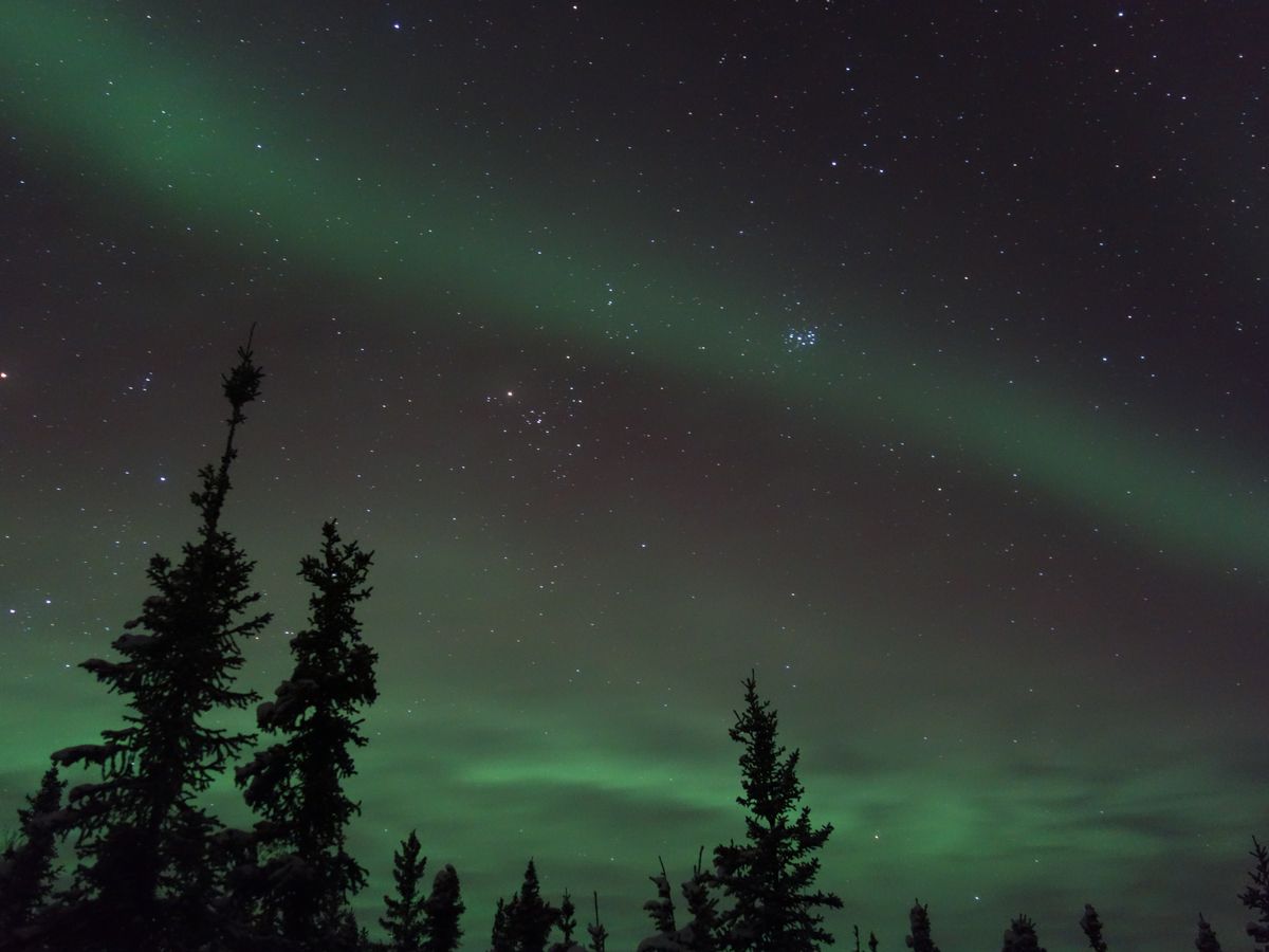 やがてバスが現地に到着し、真上にかかったオーロラに参加者全員が魅了されて見上げていました。木々に囲まれたようなロケーションでしたが、それでも視界は十分ひらけてます。むしろ写真を撮るには、木が入った方がいいのかも?