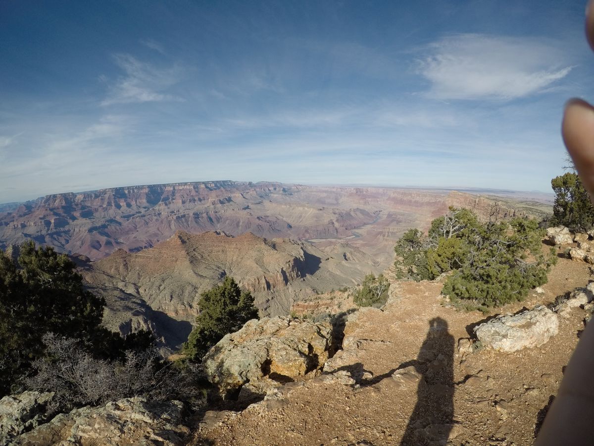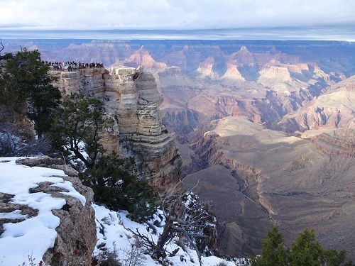 グランドキャニオンは前日雪が降ったようであちこちに雪が残っていましたが、観光当日は曇り時々晴れという天気でした。昼間は雲の間から時おり日差しが渓谷を照らし、綺麗なグランドキャニオンの姿を見ることができました。日没時は雲がかかり夕日を見ることができませんでしたが、本来は雨の予報だったのでずぶ濡れにならないだけまだ運が良かったと思っています。