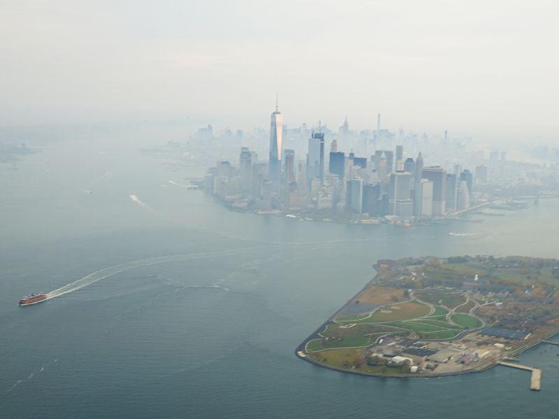 マンハッタンを上空から撮るのが目的だったので、朝靄が出るかもしれない早朝を選択。思いが通じたのか、靄の中に幻想的に浮かび上がるロウワーマンハッタンの写真を撮ることが出来ました。