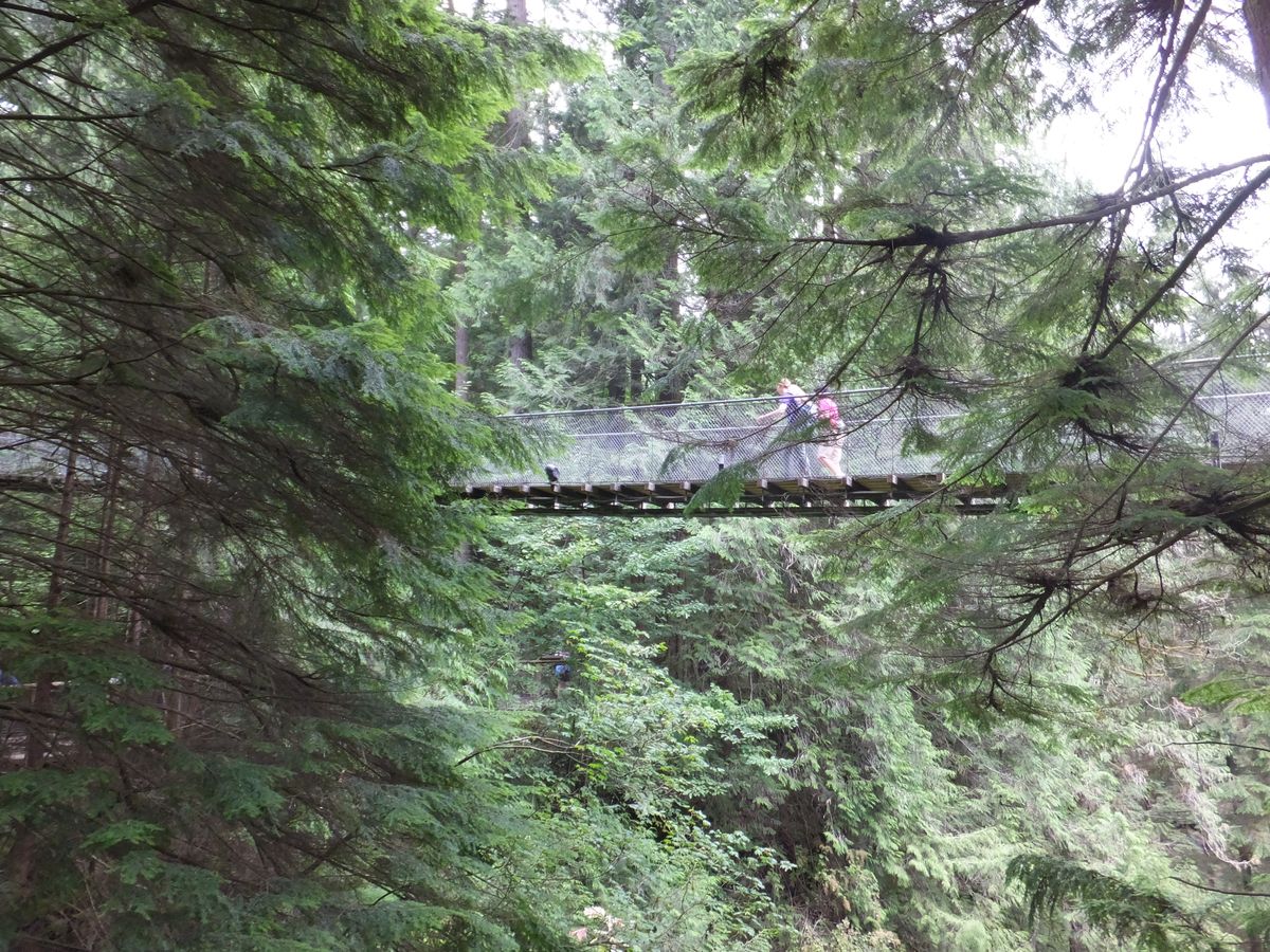 キャピラノ吊り橋は、観光名所。観光客が押し寄せる前に到着。ゆっくりつり橋を渡ることができました。