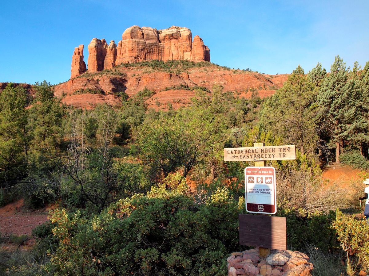 カセドラルロックでは乾いた赤い岩をよじ登り広大な景色を見渡せ