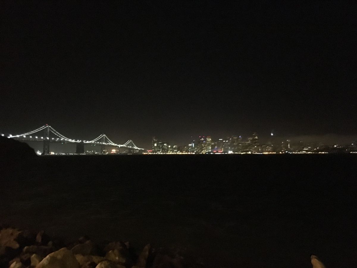 夕食を済ませた後、ホテルからの出発。昼間は快晴だったもののツインピークスでは霧が発生。霧がかかっているのもこれまた絶景。すこし油断したせいもあり、かなり肌寒い状態でした。一方、トレジャーアイランドからみるサンフランシスコは、とても澄んでいて、まるで綺麗な写真を見ているかのようです。こういった時に、良いカメラがあればと思うのですが、目に焼き付けたほうが最高です。