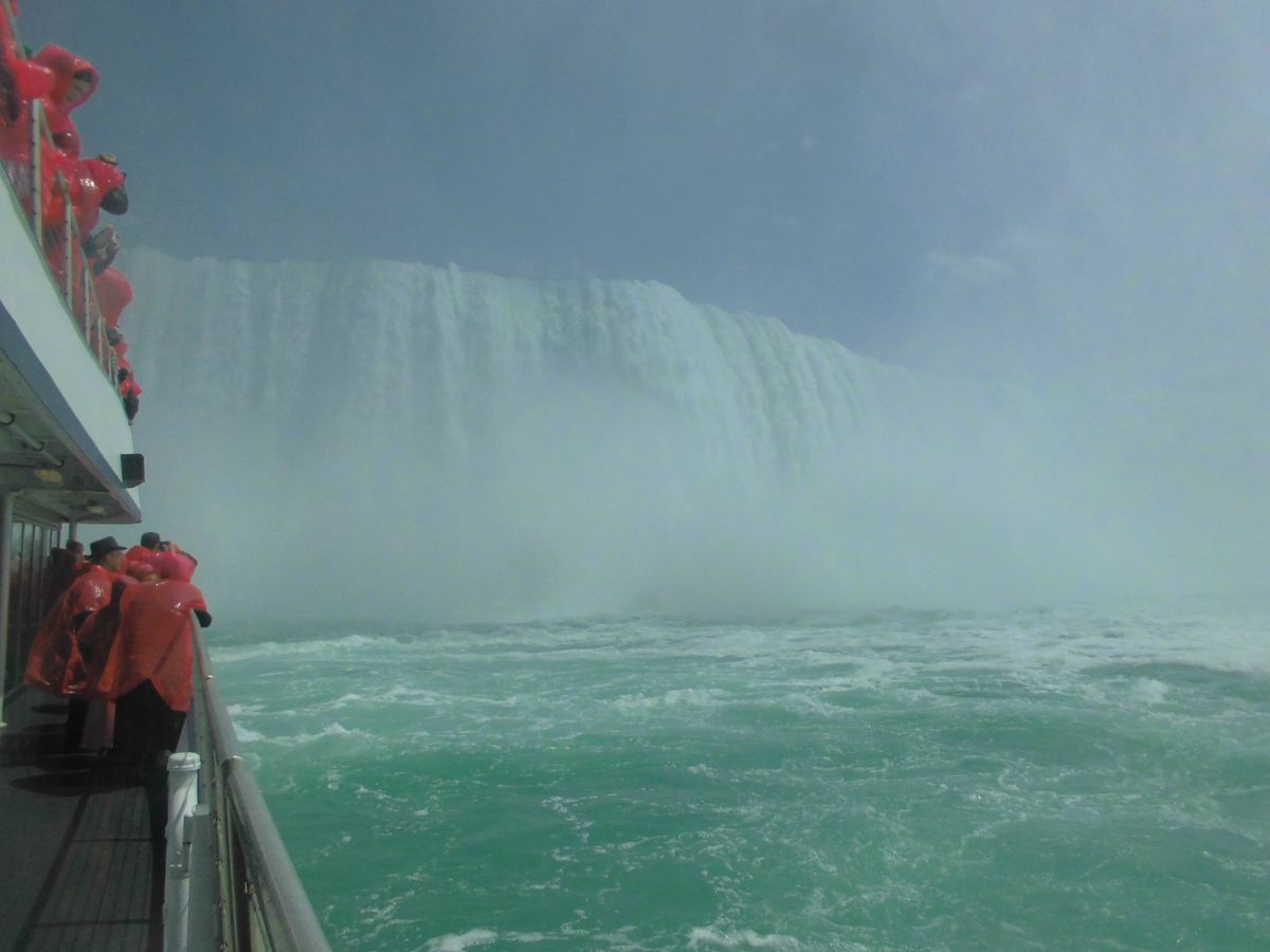 食事後、真っ赤な合羽を着て船に乗船、アメリカ滝とカナダ滝を見学することができました。カナダ滝周辺では誰もがビショビショになるほどの水しぶきがかかりましたがとても楽しむことができました。