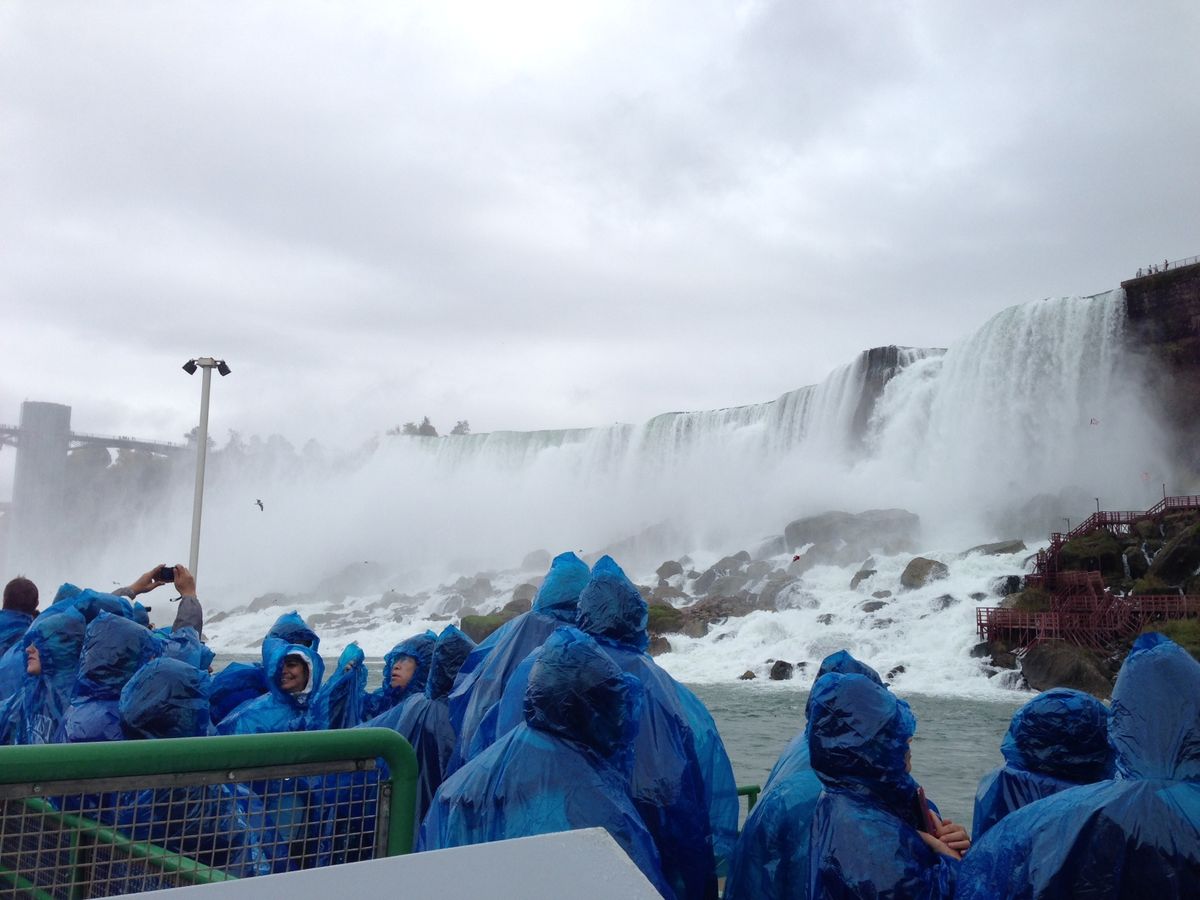 2日目も雨。滝壺に下り遊覧船に乗り滝の近くまで行く。乗船にあたり滝のしぶきで濡れないようにとビニールコートが与えられたので、遊覧船では少々雨が降っても大丈夫であった。雨が降る中なので、滝のしぶきと雨が混ざり合い滝の轟音はよく聞こえるが、その滝の素晴らしい姿は霞んで見えにくい。このように1泊2日でナイアガラの滝へ行ったものの運悪く2日間とも雨で、期待していた夜のライトアップされたナイアガラの滝を見ることができなかったことは残念でならない。