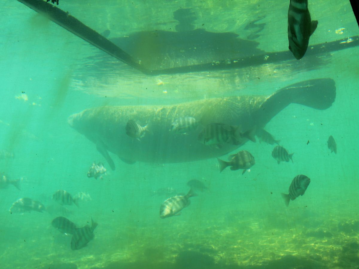 寒い頃がシーズンだと聞いていたので、会えないかもと、心配していましたが、会えました。意外に、岸から、すぐのところに、いました。水の透明度は低いのですが、ガイドの方に、この辺を見てろと言われて、待っていると、自分が浮いているところの真下に、マナティが、ぬうっと現れて、マナティの上に、自分がのかってしまうのではないかと心配になる感じでした。触ってみると、温かくて、ぬるっと、してました。背中を触ったくらいでは、なんとも思わないようです。透明度のせいで、すうっと、動いていって、いなくなる感じです。夏休みでも、きっと、会えると思います。写真は、ホモサッサ公園の水中展望台から撮ったマナティです。だいたい、こんな感じですが、一緒に泳ぐところは、こんなに透明度は高くなく、水深は、ずっと、浅いです。魚は、見えません。一緒に、泳ぐところは、水深1メートルも、ないと思います。ただ、ボートで行くので、ボートを留めるところは、足は、つかない深さです。