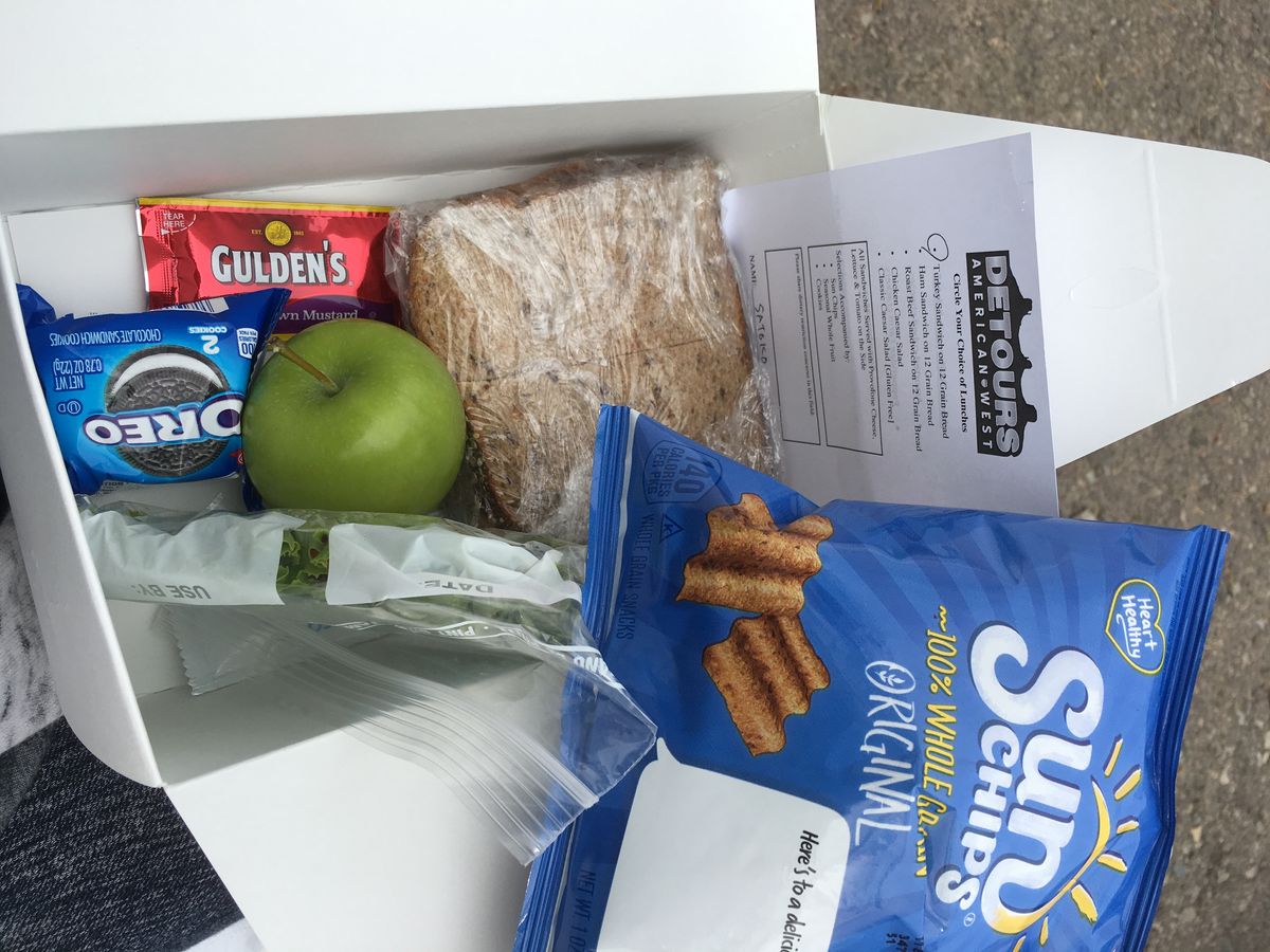 ランチは、バスに乗った際に2,3種類の中から予め選ぶよう用紙が渡されます。グランドキャニオンに着いたときにランチボックスが渡され、私はターキーサンドを選択。中にはスナックやリンゴなども入っていてボリューム満点。野菜などは別に包装されていて自分でサンドして絶景を見ながら食べました。