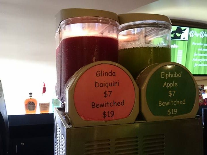 会場に入ると(他の観光地同様、セキュリティチェックあり)会場内のあちこちに既に演出が施されています。販売する飲み物まで(写真参照)。Wickedに扮して写真を撮るコーナーもありました。