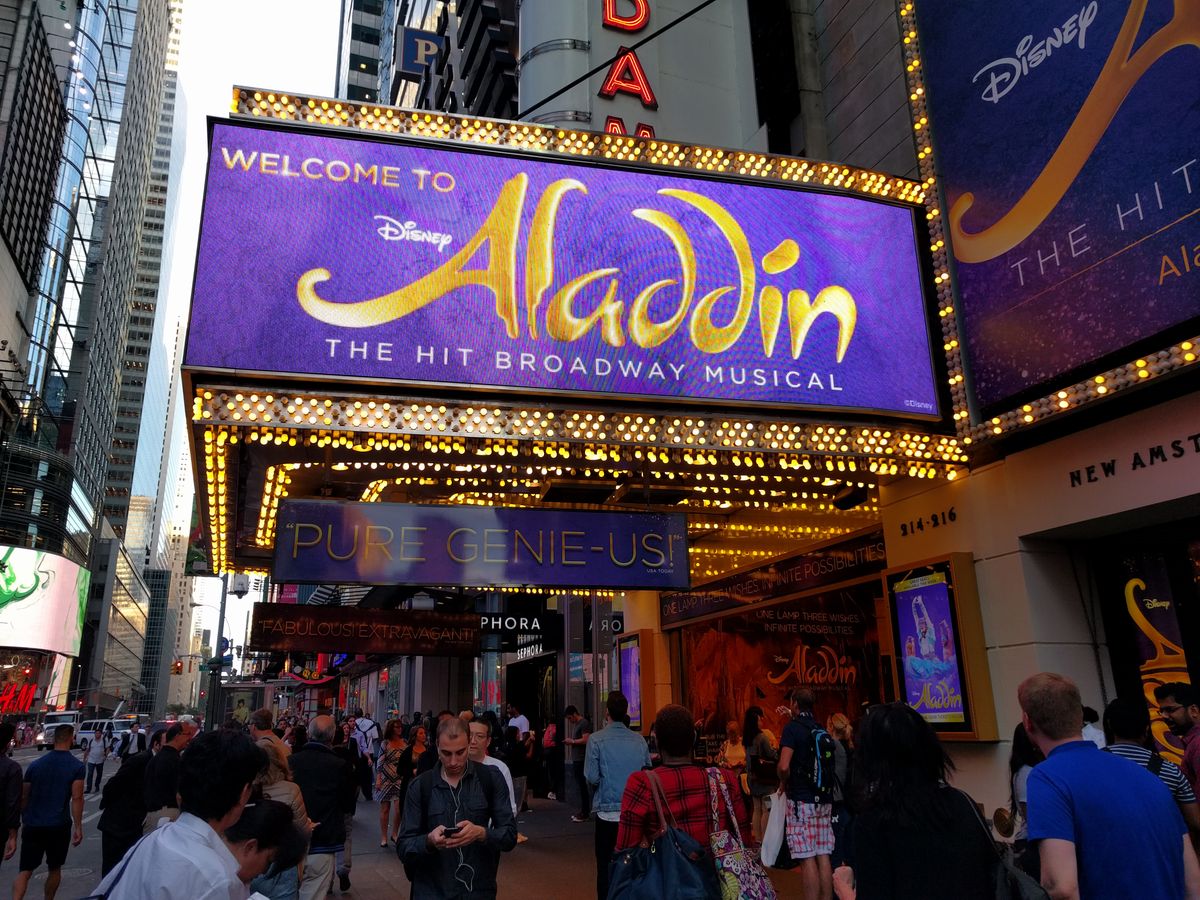 ニューヨークにいくのなら、やはりブロードウェイを見たいと思い、英語に自信がなくても楽しめそうなアラジンにしましたが、大正解でした。コミカルなギャグ、ハラハラするアクション、ロマンチックなシーン、すべて素敵な歌とともにゆっくり楽しむことができました。