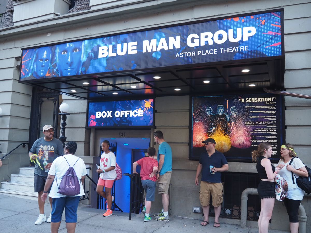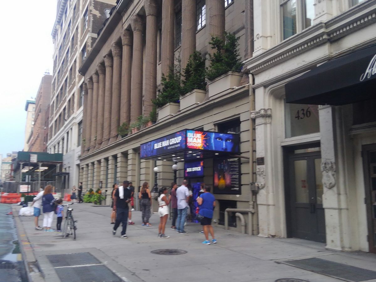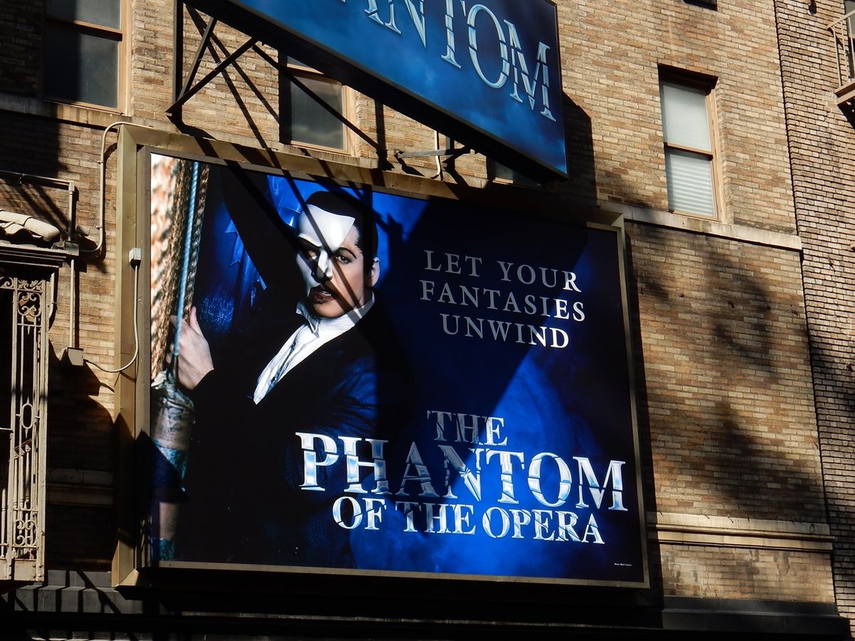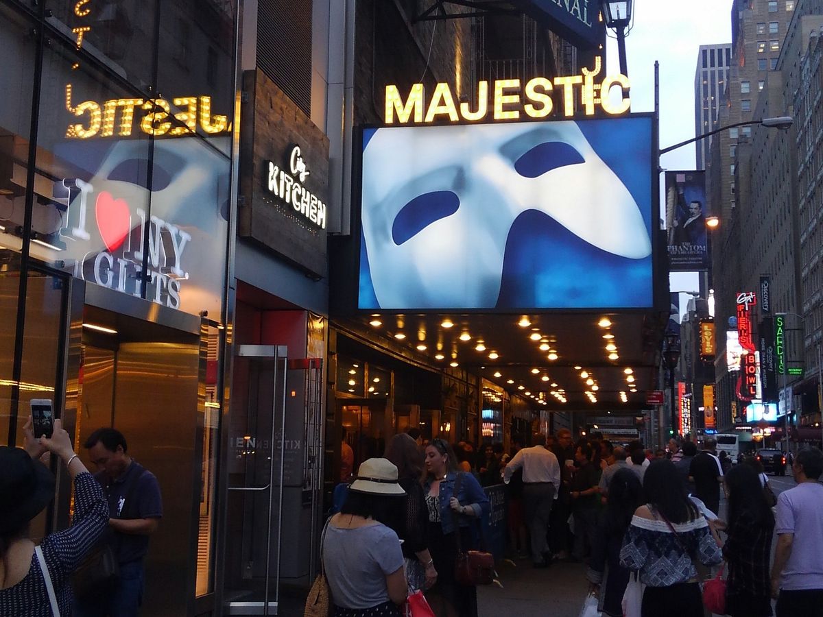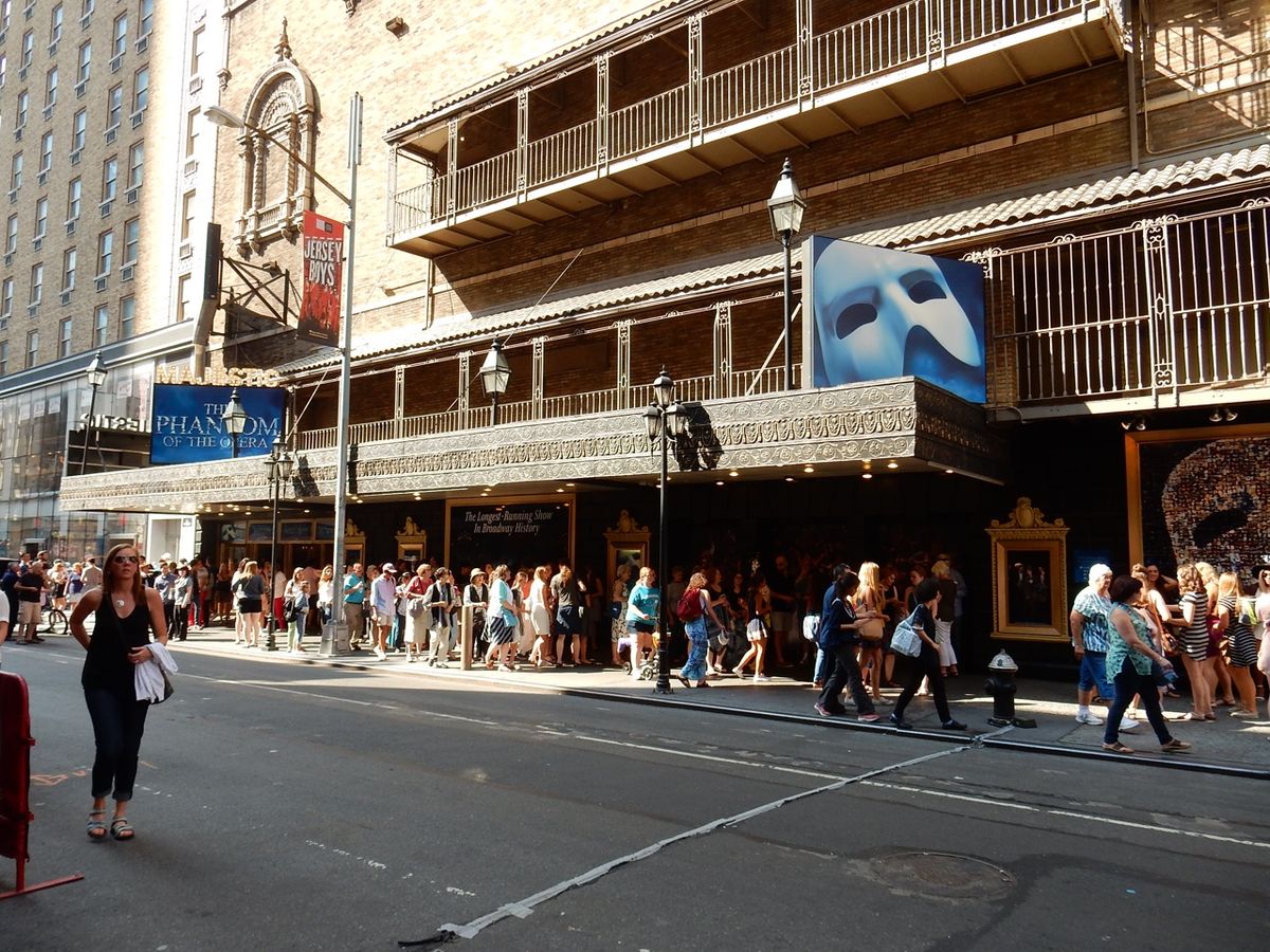 タイムズスクエアーから歩いて数分。すぐにファントムの青白い仮面の看板を携えたマジェスティックシアターが見つけられます。少し視線を下げると、開場を心待ちにしている人々の列が目に飛び込んできました。