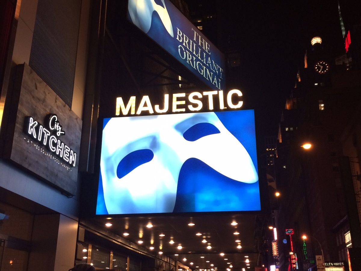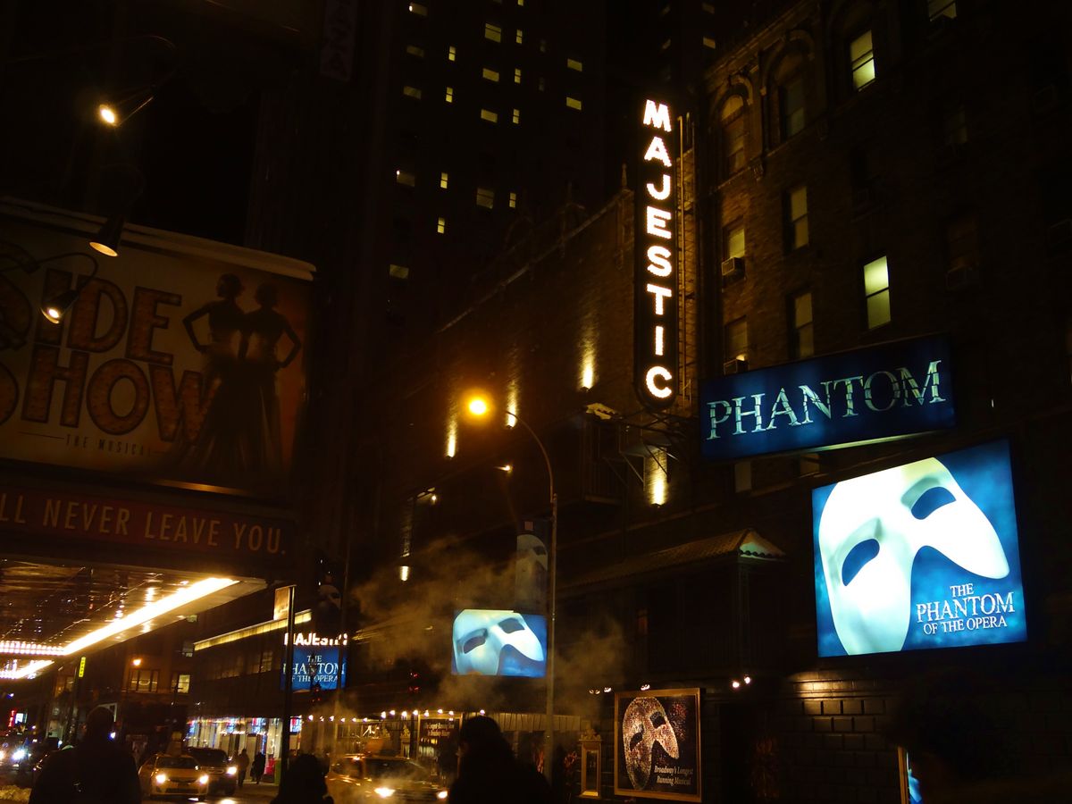 ブロードウェイでミュージカルを見てみたいと思い、チケットを購入しました。窓口でバウチャーを見せるとチケットが受け取れます。平日で大雪の次の日の最終公演でしたが、客席は満席でした。安い方のチケットでしたが、一階の中央よりも少し左ぐらいでしたので、見やすかったです。夜のマジェスティックシアターは、外見も映画に出て来そうなニューヨークの街並でとても素敵でした。やはり本場のミュージカルは鳥肌ものでした。ロングランで愛される公演を見れて本当によかったです!