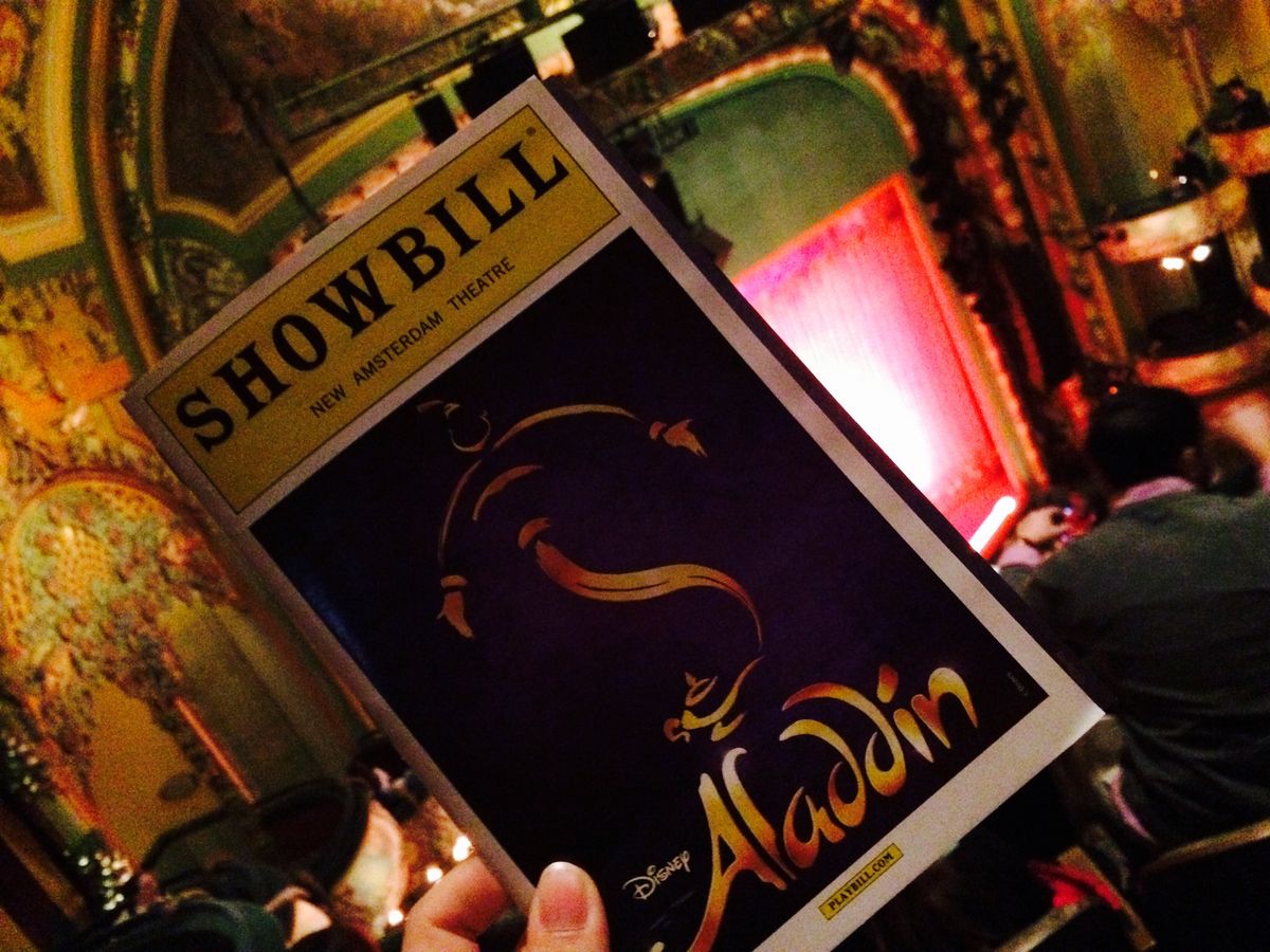 作品を観ての感想はとにかく迫力がすごい、に尽きます。衣装も煌びやかで豪華でしたし、舞台装置もすごかったです。英語がわからなくても映画のアラジンを見ておけばそこまで気にする必要はないと思います。それと、やはりお国柄でしょうか、客席の歓声がすさまじかったです…曲がおわるごとに拍手歓声の嵐、特にトニー賞を受賞したジーニー役の方が歌った曲の終わりには暫く歓声と拍手が鳴りやまらなかったです。普段日本で演劇を観る機会が結構あるのですが、それでもびっくりしました。