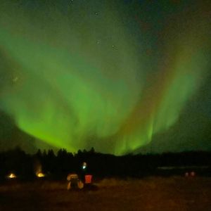 バスでキャビンに向かう途中にオーロラが出現!そしたら、途中、湖に寄ってくれはって、そこでも写真撮ってもらいました。