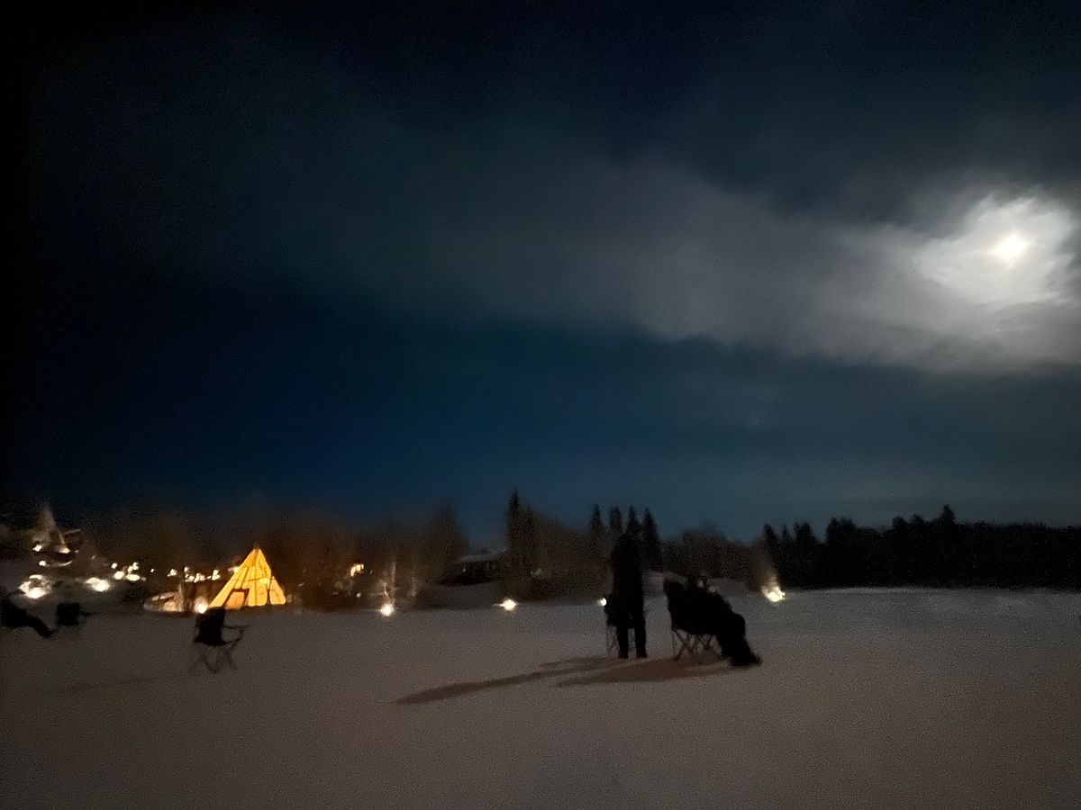 初日は雲が多く残念ながら見ることができませんでしたが、一面雪景色で、湖も凍ってて広い空間を散歩したり、フリーレンタルの椅子に座ってボーッとしたりオーロラはないけど楽しく過ごしました。