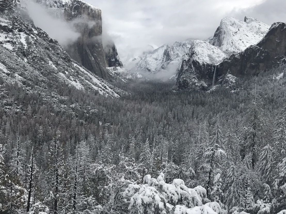 前日の雪でうっすら雪景色のヨセミテはとても幻想的で素敵でした。天気予報での寒さを心配しましたが、雪景色と秋の気候で最高でした。