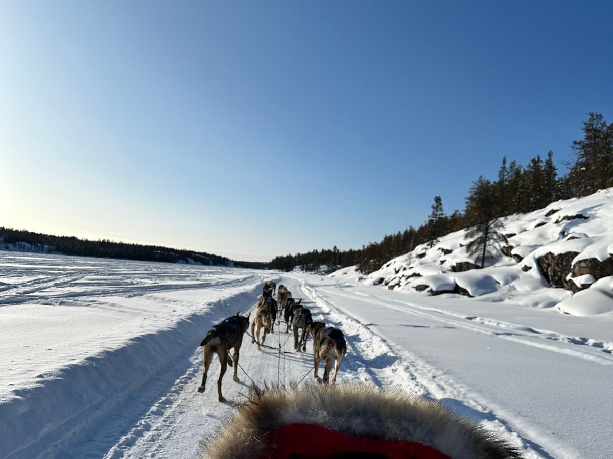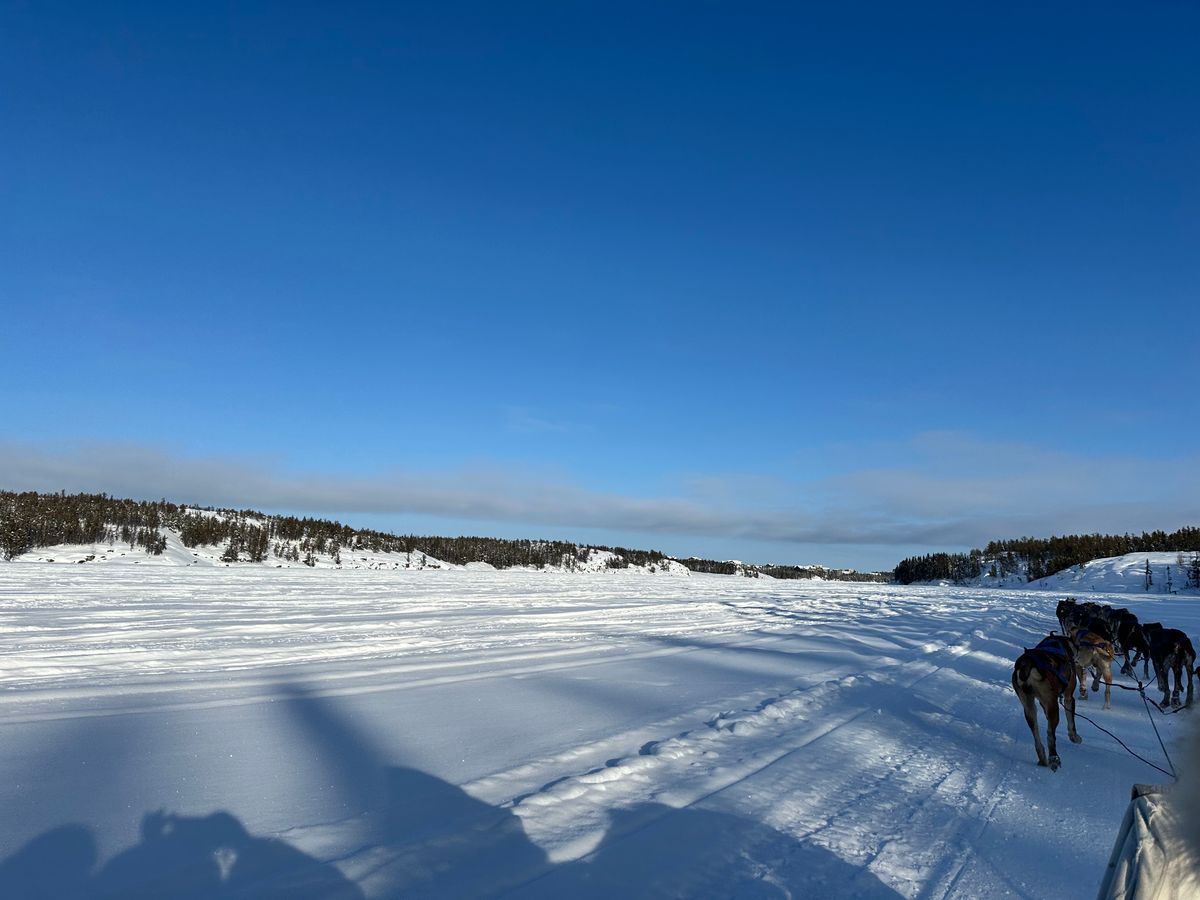 犬ぞりは思ったよりもスピードが出て、凍った湖の景色を楽しみながら、どんどん進んでいきました。