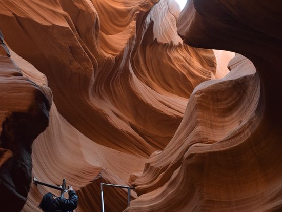 地下に広がる地層の世界。地面の隙間から階段を降りると別世界が。鉄砲水で岩が削られてできた洞窟で光と色のグラデーションは芸術的です。