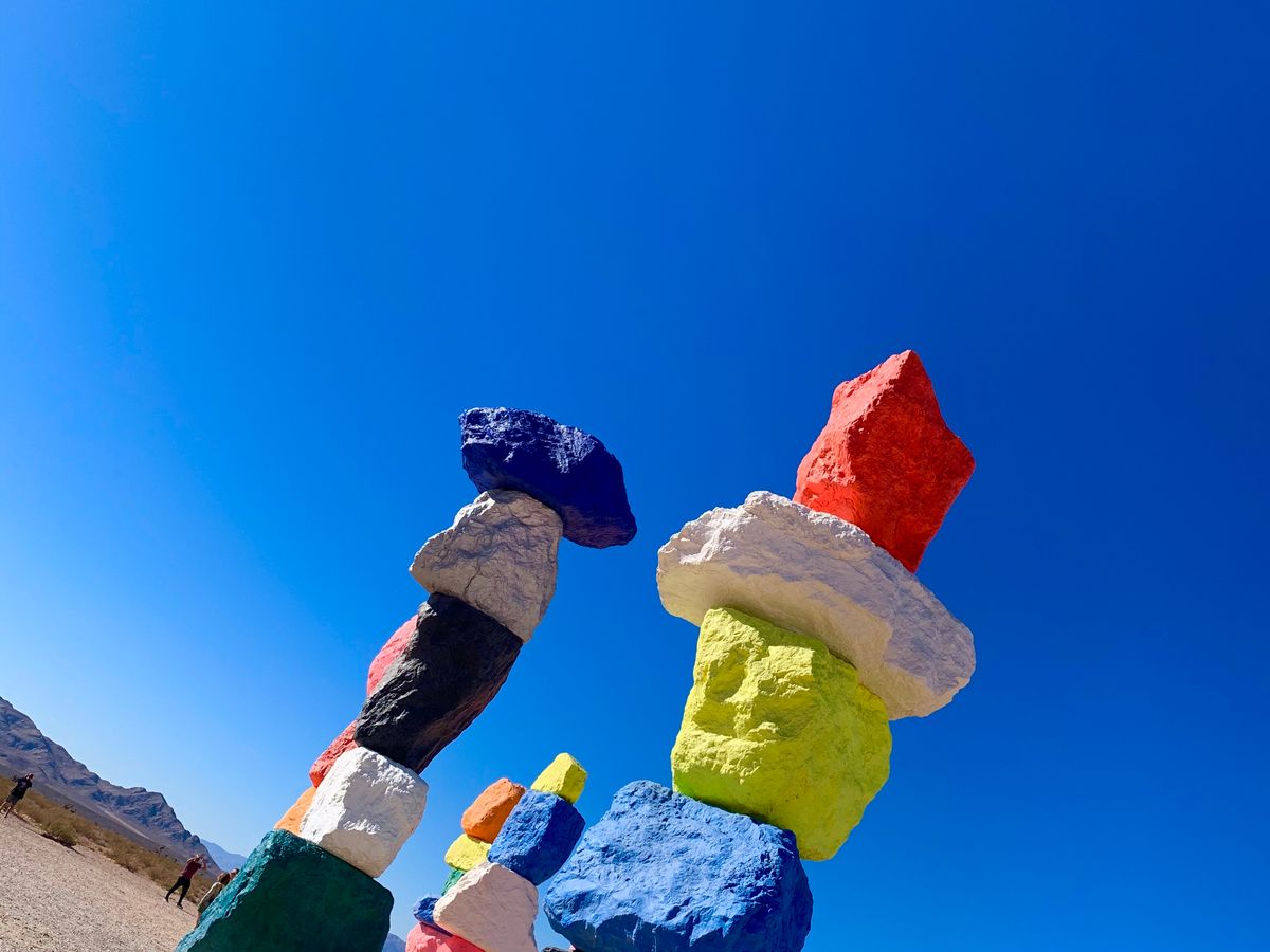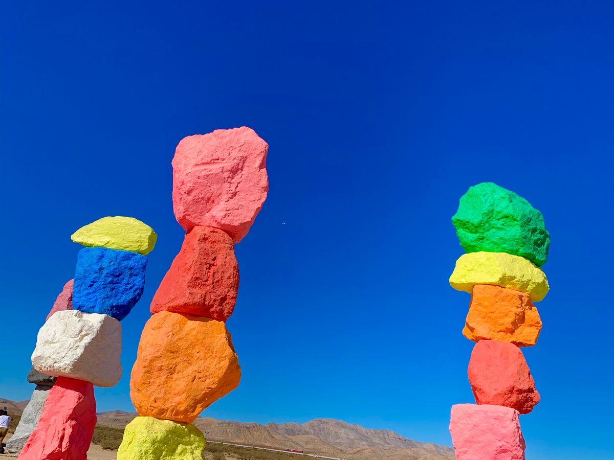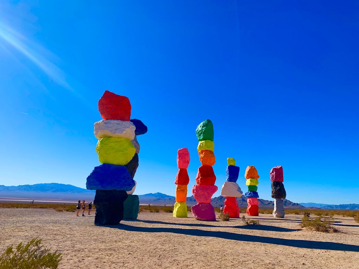 期間限定で見られるSeven magic mountainsはラスベガスに行ったら是非見てもらいたいです。青い空にヴィヴィッドカラーの石像がドーンと砂漠に建つとっても不思議なインスタ映えスポット!都心部からもそこまで離れてはいないのですが何もない砂漠地帯にあるのでレンタカーかツアーが必須になります。