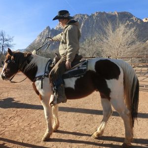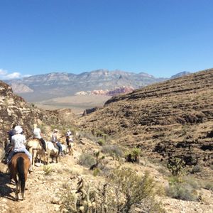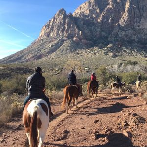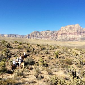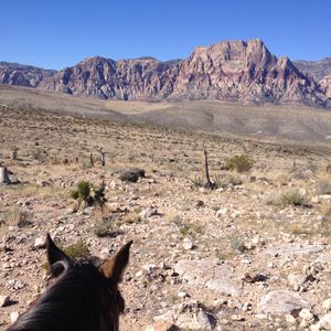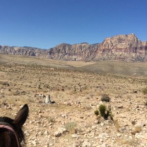 乗馬はもちろん初めて、でもこれまでの方の体験談を読んで、何とかなるのではないかと思い申し込みました。当日現地で、英語で馬の乗り方?の説明がありましたが、英語のできない身としては、理解できませんので、ちょっと不安が募りました。それでも乗る馬を指定いただき、いざ乗馬。手綱と鞍をしっかり持っていざ出発。平地を坦々と行くのかと思いきや、先頭の方は岩の上にいるではありませんか。しかもそこは細い、ごろごろ道。おいおいと思いながらも、何とか馬をなだめて、後についていきました。レッドロックキャニオンのよく見渡せるところで、小休憩。乗るのも大変ですが、降りるのも一苦労なので、乗馬したまま記念写真。楽しむ以前で、大いに汗もかきましたが、67歳の老夫婦としては、とても楽しい経験をさせていただきました。ガイドの方も丁寧で、所々で後ろの様子も見てくれます。馬もおとなしく調教されているので、素人にもやさしかったです。お世話になりありがとうございました。ラスベガス訪問は、29回目で一応の大自然ツアーには参加していましたので、今回は乗馬ツアーを申し込みましたが、新しい体験で次回も挑戦したいです。なお、日本人旅行者の希望としては、折角レッドロックまで行きましたので、近くのサマリンのショッピングセンターとの組み合わせを考えていただけるとなおうれしいです。(何時間後かに、ピックアップしてもらえるような仕組みです)