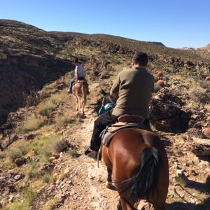 初めての乗馬でとても緊張していましたが、とっても楽しく過ごせました。スタートから柵のない岩山へ向かった時はドキドキして綱を掴む手に力がはいりましたが、良くなれたお利口で優しいお馬さんたち(マギーとTJという子たちです)にあっという間に慣れ、素晴らしい景色を見ながら乗馬できました。崖近くを通ったり、登ったり、下ったりと飽きないコースです。広い青空に見渡す限りの大自然で写真もいっぱい撮れました。私たち以外は欧米人で英語のみですが、綱の引き方は片言日本語を交えて後から教えてもらえました。2時間以上乗りっぱなしなので、お尻はちょっと痛くなりましたが・・・(翌日筋肉痛でした)大・大・大満足です。またラスベガスに行く時は参加したいです。外国のオプショナルツアーにしては珍しく10分前にお迎えが来ました。しかも私たちが最後のピックアップだったので、注意事項に書いてあった「20分前には到着」を守ってよかったです。そういう面でもしっかりした会社だったのだと思います。
