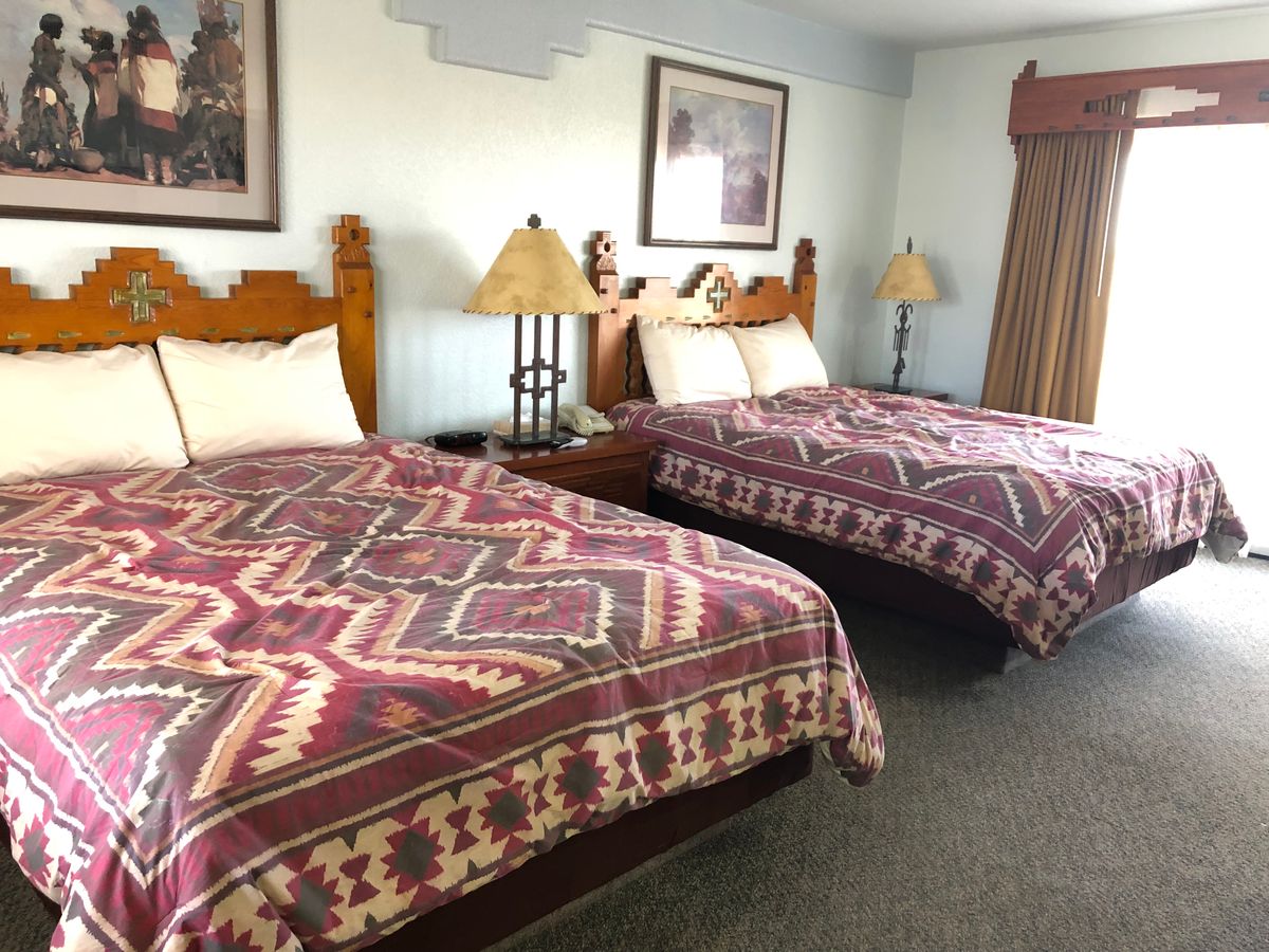 一泊目のモニュメントバレーはザ・ビューホテルを選ぶお客様が多いようですが、チェックインの合間にビューホテルのお土産屋や展望台に行くことができたり、ジープツアーで目の前まで行けるので、様々画角で写真を撮りたい方はグールディングスロッジもオススメです。モニュメントバレー全景を楽しむ事ができ、朝方は日の出に照らされた真っ赤なメサがとても壮大です。レストランもナバホ族の地元の方が訪れる、お墨付きの素晴らしい味でした!