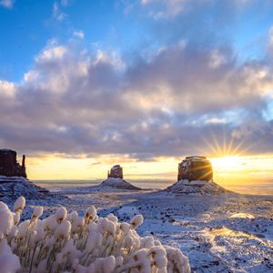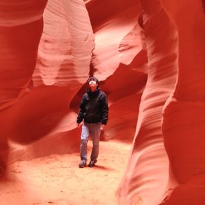 神秘的なアンテロープ 高所大好き人間にはたまらない絶景のホースシューベント モニュメントバレーの夕陽は赤茶けた大地との絶妙な景色で3つのビュートが語りかけてくるようでずっと眺めていました。それがなんと翌朝は雪景色!! しかも晴天!! こんな三拍子揃ったレアすぎる景色の中で朝日鑑賞。それをジープツアーで独占してナバホ族の方の演奏、歌声聞くことが出来たうえに、神聖な場所で何度にも反響する雄叫びまで体験することができました。