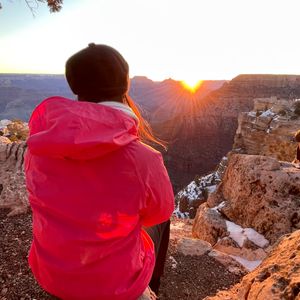 グランドキャニオンの日の出観賞は、-1度の中で、ニット帽、手袋、ダウンなど防寒具は必須です。私は、ウルトラライトダウンに、ウインドブレーカーを重ねて着ました。ホッカイロも役立ちました。