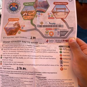 シーニック航空のバスがホテルに迎えに来ます。その後40分かけ、飛行場へ。チェックインして1枚のスケジュールを渡されます(腕に紙のバンドを巻かれますが、荷物検査などはないです)。そして、小型機で空の旅!絶景です。ウエスタン飛行場についたら、注意事項のビデオを見ます。しばらく待って、ヘリポートへ。渓谷の中をヘリで入っていくため、迫力あり!川の側に到着後、ボートで川からグランドキャニオンを見れます。サービスで写真撮ってくれます。飛行場に戻り、バスでイーグルポイントに向かいます。ここから自由行動です。注意点が、大きい荷物を持っていると、バス乗る前の検査で注意されます。持っている場合には、飛行場に預けます。イーグルの形をした岩を見ることができます。スカイウォークは、現地でチケットを買うことができます。スカイウォーク行きましたが、正直、ここよりもマーサーポイントの方が絶景でした。時間もあまりないので、スカイウォークには、入らなくてもいいかもしれません。時間がなくなる理由は、バス待ちの長蛇の列です。マーサーポイントでは、軽食を食べられます。柵のないマーサーポイントで見る景色も良かったです。いちばん先端まで行ってみてください!帰りの時間が決まっているので、それまでに飛行場に戻らなくてはいけません。飛行場に戻り、最後のフライト。出発空港に戻ると、帰りのホテルの場所を聞かれます。バンでホテルへ戻ります。グランドキャニオン見るなら、サウスリムもおすすめですが、ウエストリムから見る景色もアメイジングです。楽しいので、ぜひ参加してみては。