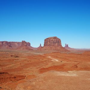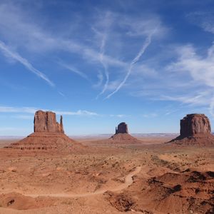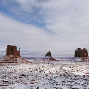 真っ赤な大地にそびえる不思議な形の岩山の他にも見どころはたくさん。古くからナバホ族居住地でもあることから彼らの文化や習慣を体感する内容が盛り込まれたツアーも人気です。また、アメリカの大自然をまるごと楽しみたい方にはグランド・キャニオンやアンテロープ・キャニオン、ザイオンなどにあわせて行けるツアーもおすすめです。 モニュメントバレーの荒涼とした風景は、映画「駅馬車」をはじめ、多くの西部劇でロケ地として使われています。「バック・トゥ・ザ・フューチャー3」や「フォレストガンプ」の印象的なシーンやCMでも登場するので、「どこかで見たことのある景色」と感じる方も多いかもしれません。 何千万年という長い時間をかけて雨や風に削られ、テーブル状の大地(メサ)や細い柱のようになった岩山(ビュート)が点在する荒野モニュメント・バレー。300m級のビュートが巨大な記念碑(モニュメント)のように見えることから、モニュメント・バレーと呼ばれています。