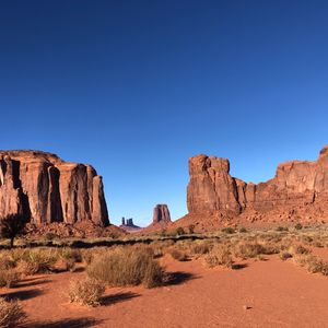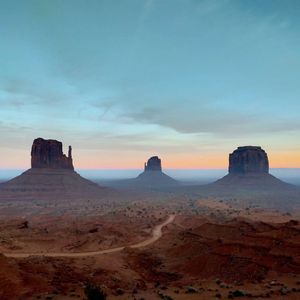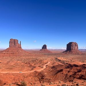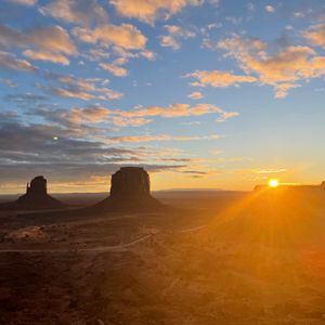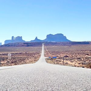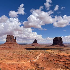 真っ赤な大地にそびえる不思議な形の岩山の他にも見どころはたくさん。古くからナバホ族居住地でもあることから彼らの文化や習慣を体感する内容が盛り込まれたツアーも人気です。また、アメリカの大自然をまるごと楽しみたい方にはグランド・キャニオンやアンテロープ・キャニオン、ザイオンなどにあわせて行けるツアーもおすすめです。 モニュメントバレーの荒涼とした風景は、映画「駅馬車」をはじめ、多くの西部劇でロケ地として使われています。「バック・トゥ・ザ・フューチャー3」や「フォレストガンプ」の印象的なシーンやCMでも登場するので、「どこかで見たことのある景色」と感じる方も多いかもしれません。 何千万年という長い時間をかけて雨や風に削られ、テーブル状の大地(メサ)や細い柱のようになった岩山(ビュート)が点在する荒野モニュメント・バレー。300m級のビュートが巨大な記念碑(モニュメント)のように見えることから、モニュメント・バレーと呼ばれています。