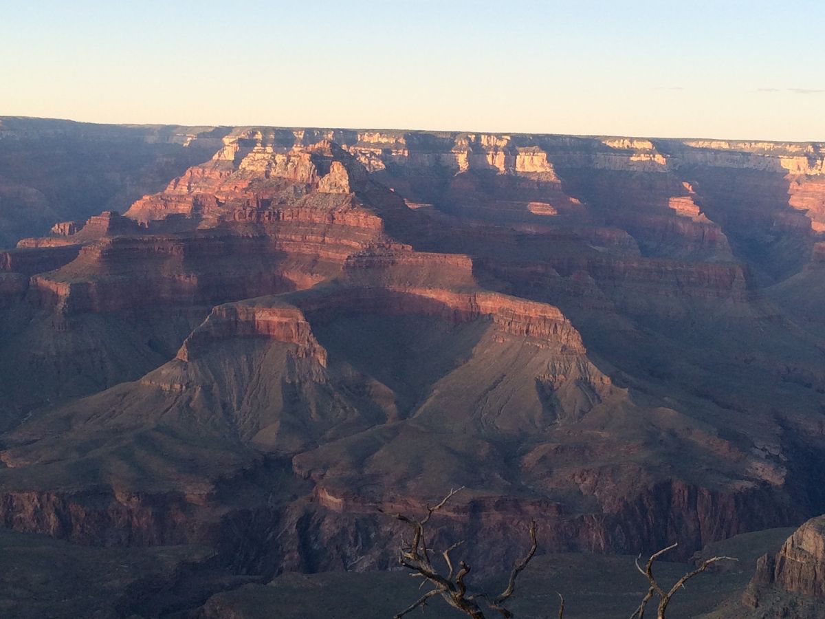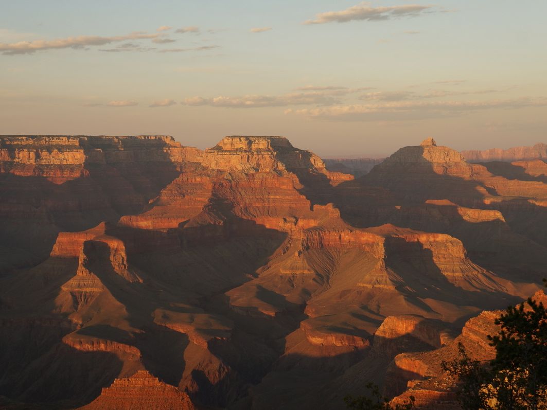 雲が厚くて夕陽が沈む景色は見られなかったけど、夕陽に染まるグランドキャニオンは壮大で幻想的でした。ガイドさんが絶好のスポットに案内してくれ、とてもいい写真が撮れました。時間的なものなのかあまり他の観光客がおらず、景色を存分に味わえました。