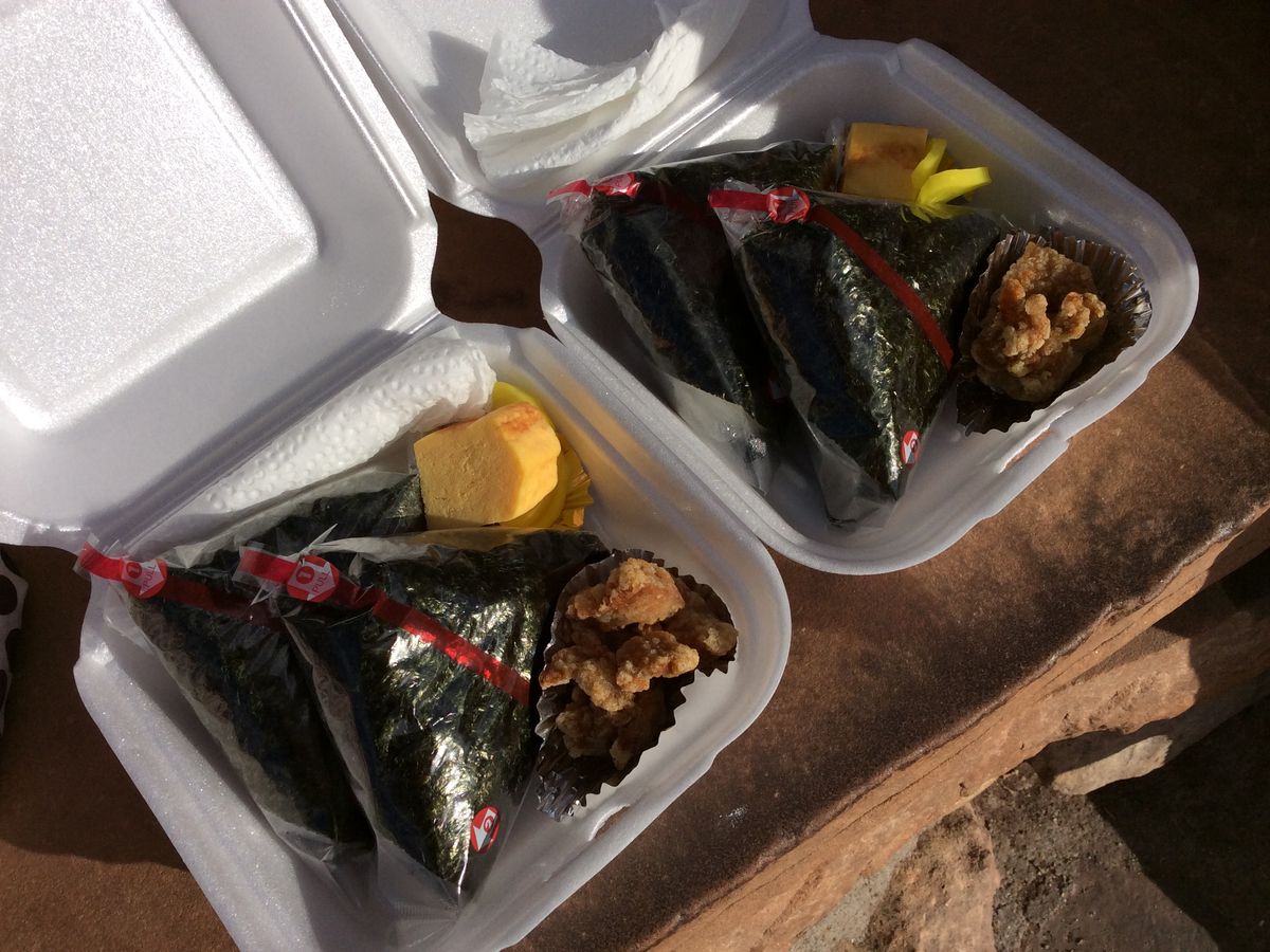 昼食のおにぎりは、『ブライトエンジェルロッジにて観光とショッピング』の時間に配られます。昼食と言うより、夕食の時間帯です。初めての休憩場所で、コンビニ的なお店に寄り、その時に軽い食べ物を購入できますが、非常食的なおやつと飲料を持って行かれることをお勧めします。