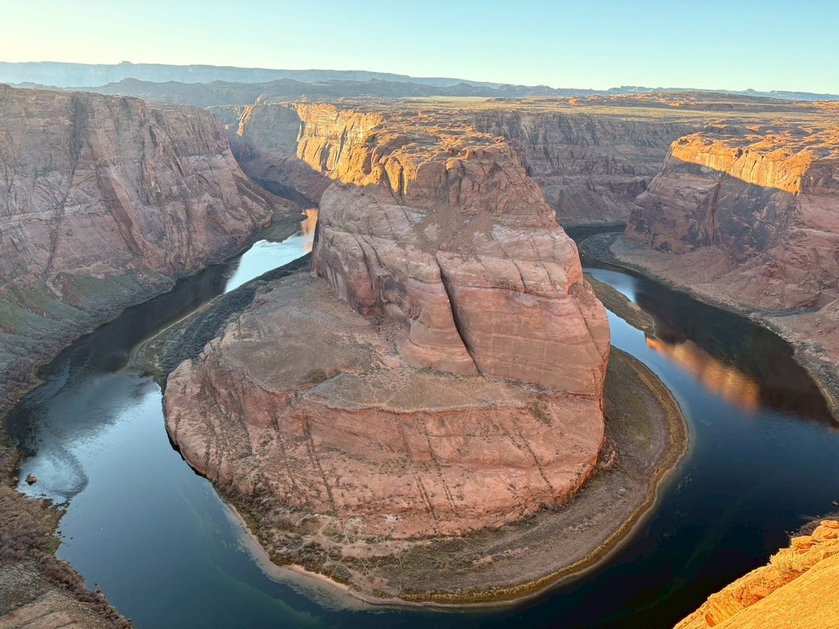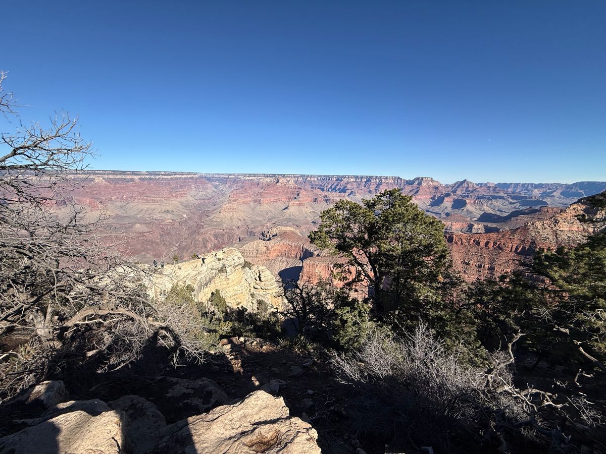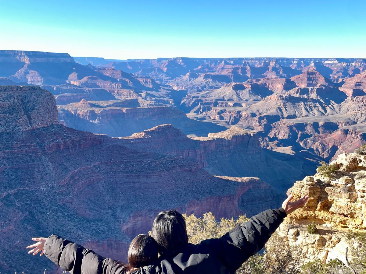 まず、本当に絶景です。ありきたりな表現ですが、スケールが違います。でかすぎて1枚の絵画のように見えますが、だんだんと谷底の川や下方のトレッキングコース、自分のすぐ横の崖の切り立ち方に「もしかして奥行きがある…?」と気づいてから慄きます。地球に思いを馳せる時間が発生するので、到着前に説明してもらえるグランドキャニオンの成り立ちや発見の歴史の話はちゃんと聞くことをおすすめします。