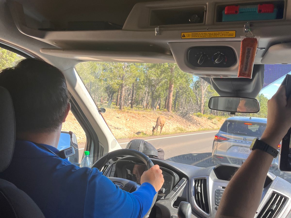 一番目的のグランドキャニオンは夕日の時間は雨が降ったり止んだりで、雷の危険を避けるために何度かルート変更をしてその時間ならではの景色を楽しみ、朝はバッチリの天候の下、朝日に照らせれた奇跡的に美しい風景を見ることが出来ました。グランドキャニオンでは野生のエルクや猪にも遭遇し、とても楽しい時間となりました。