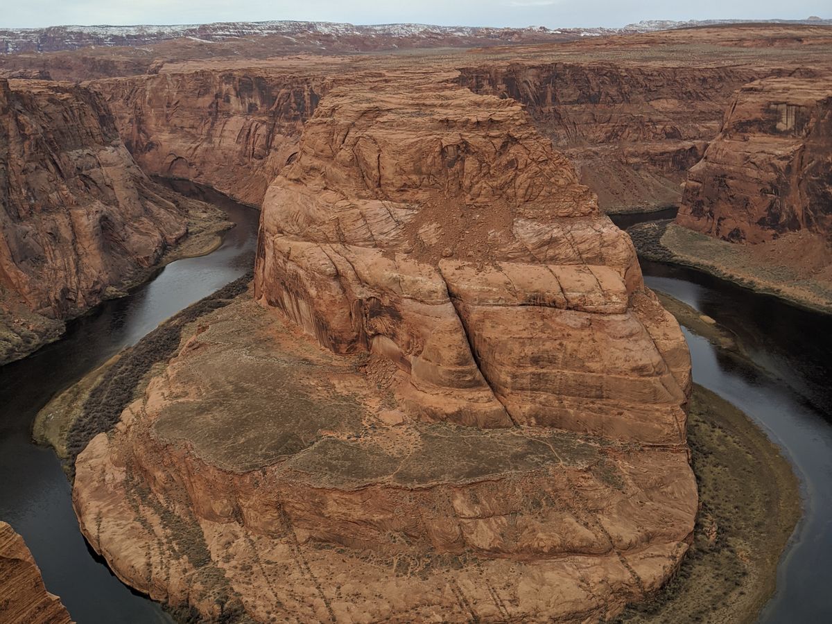 1つ目のホースシューには8時前くらいに到着した。軽く雪が降っていたためかなりの寒さであった。0度前後であり、東京の真冬の格好でも少し寒いレベル。自然が作る景色は素晴らしかった。柵があるので普通に観光する分には全く問題ないが、柵がないところは崖の端まで行くことができ、油断すると危険。1年前にイギリス人の少女が落ちて亡くなったと案内があった。