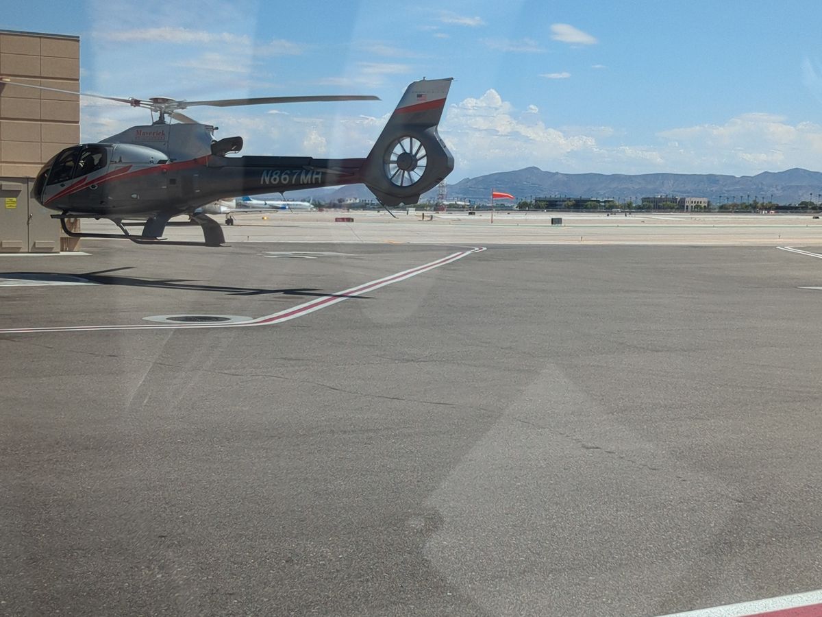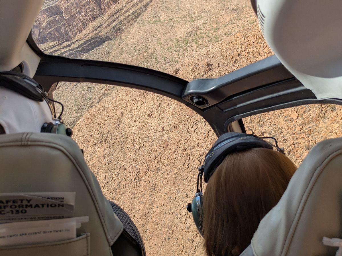 当日は、4機のヘリコプターでのツアー 1機にはパイロットを除いて後部座席4人・前部座席3人の 計7人乗ることができます。空港→グランドキャニオンウエストランディング→給油立ち寄り→空港で 途中2回の着陸があり その都度 後部座席右側→後部座席左側→前部座席と席替えをしてくれます。