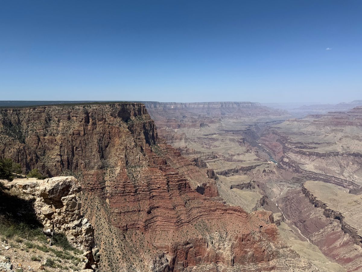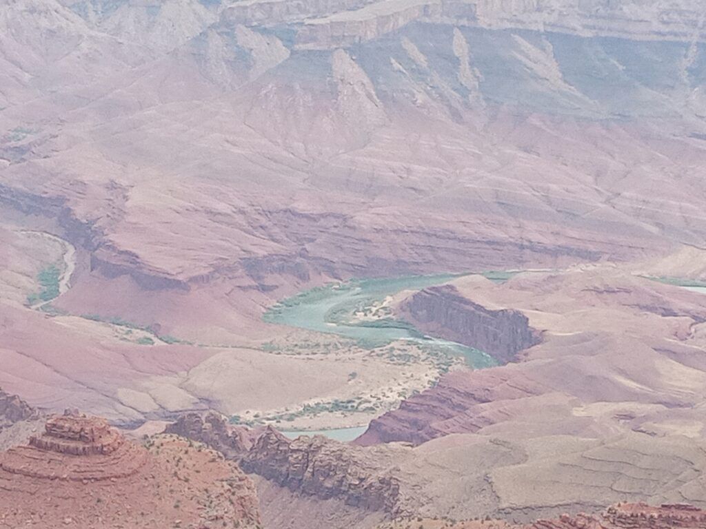 そして、いよいよグランドキャニオン国立公園のビューポイントへと向かいます。国立公園内にはいくつものビューポイントがありますが、その中でガイドさんオススメのポイントへ。駐車場は少ないところなのですが、いろんなもの(18億年前の地層や川などを含め)が見られるポイントでガイドさんたちの中では一番の場所だということ。