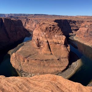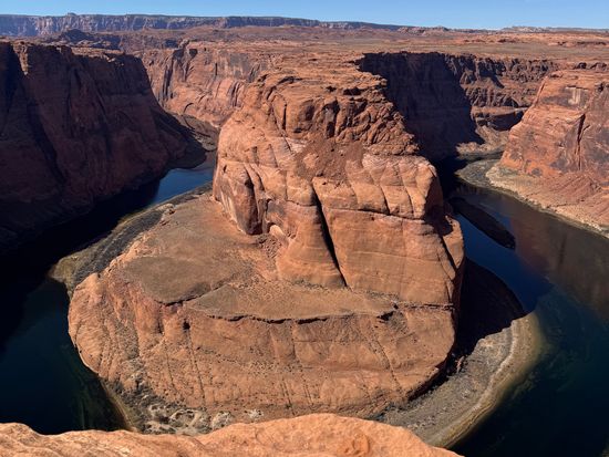 続いては、ホースシューベンドへ。駐車場から1kmちょっと歩いたところから見える渓谷で、川の侵食によりできた形が馬蹄に見えることが由来です。形的には日本の徳島県の祖谷渓のひの字渓谷に似ています。手すりもありますが、撮影スポットは断崖絶壁なので足もすくみます。
