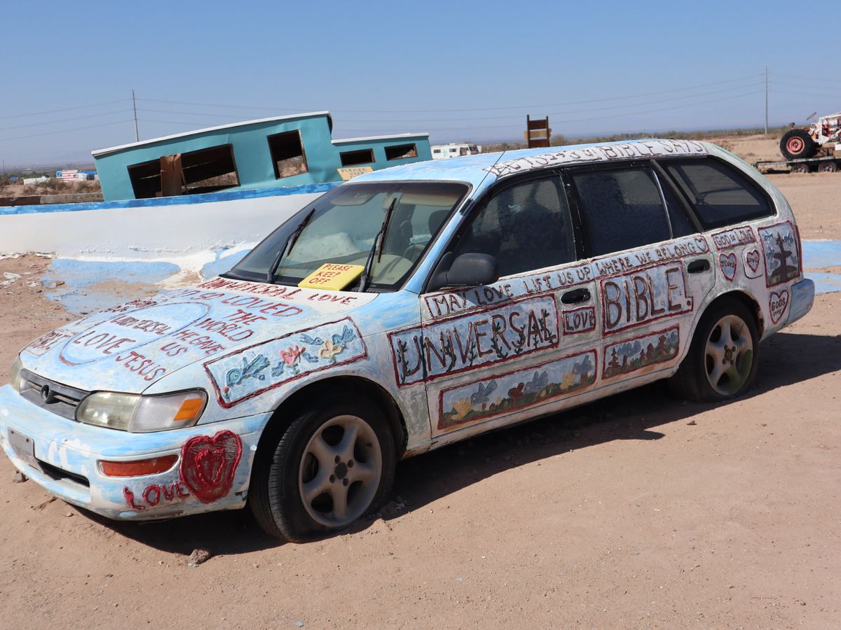 車内でもロサンゼルスのお話を聞かせていただき、朝早い時間なので眠いかな?と思っていましたが、話が楽しく旅の参考になることばかりで、あっという間にサルベーションマウンテンにつきました。サルベーションマウンテンとイーストジーサスでは、たくさんの写真と、面白い動画もとってくださいました。