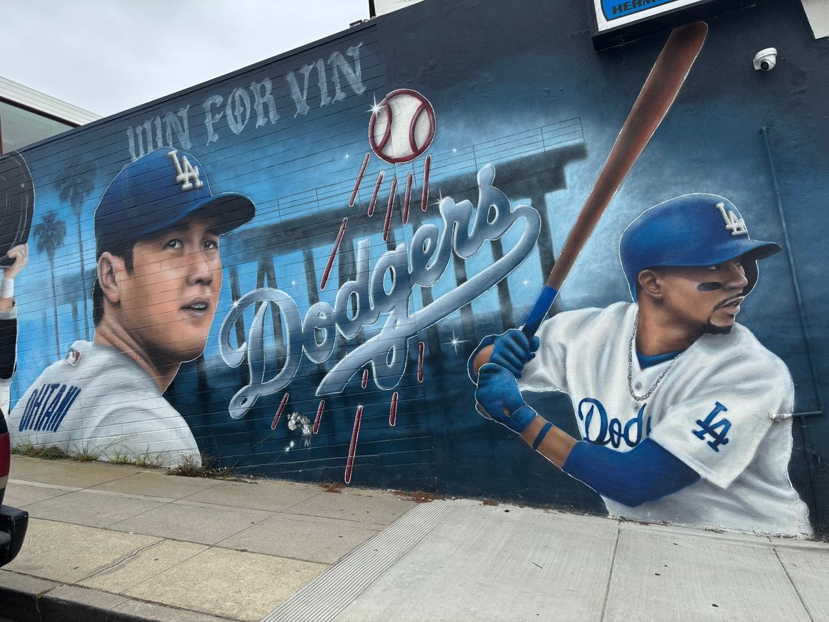 最終日のホテルから空港までの送迎に少し観光を入れていただきました。ミヤコホテルの大谷選手の壁画をみて、天文台へ。あいにくの曇り空で視界はそれほど良くはなかったですが、朝早いこともあり空気が澄んでいてのんびり散策できました。夜景も良いけど朝もオススメです。ハイキングしている方がたくさんいました。空港までまだ時間があったので、ビバリーヒルズ、ロデオドライブ、UCLAなどを盛りだくさんのお話を伺いながら映画を思い浮かべました。ガイドのなみきさんが時間を調整しながらまわってくれました。最後は空港近くの地元の人しかいかないビーチに連れていってくれました。そこで最初に書かれた大谷選手の壁画を教えてくれました。こちらは大谷選手とベッツ選手が2人並んだ壁画です。わがままいっぱい時間ギリギリまで案内していただけるのでオススメです。