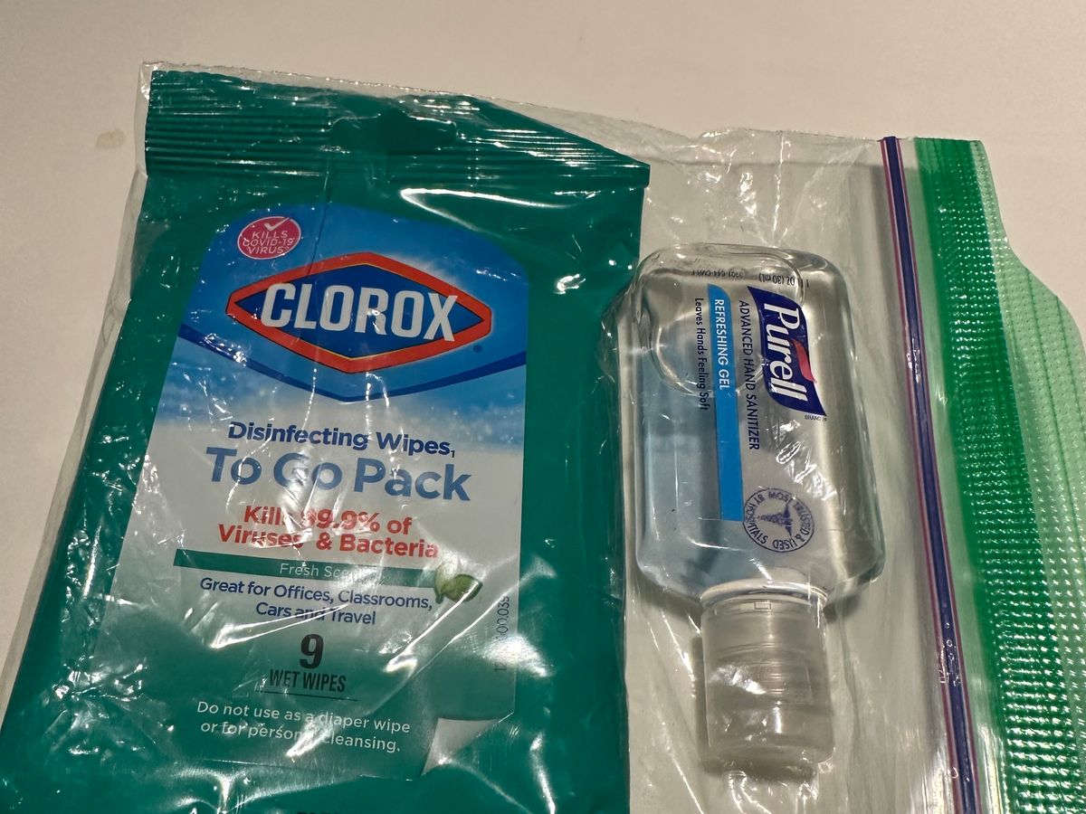 空港内で使用できるよう除菌シート、ジェルを持ち込みサイズのビニール袋に入れてくれて、いただいたました