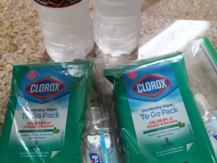 お客様には、ホテルや機内でウイルス感染防止のため、ハンドサニタイザーと携帯用除菌ワイプをお渡しします。