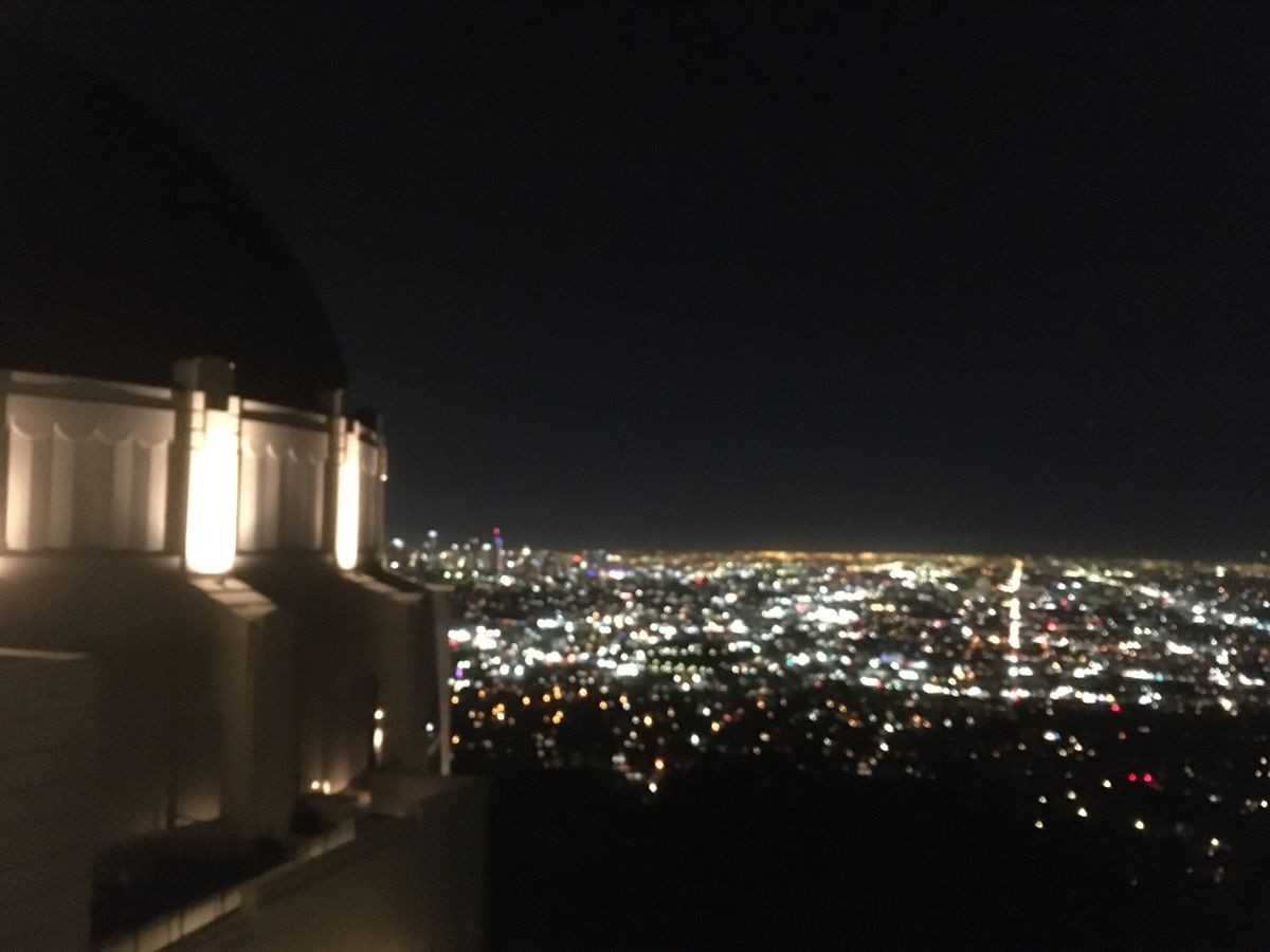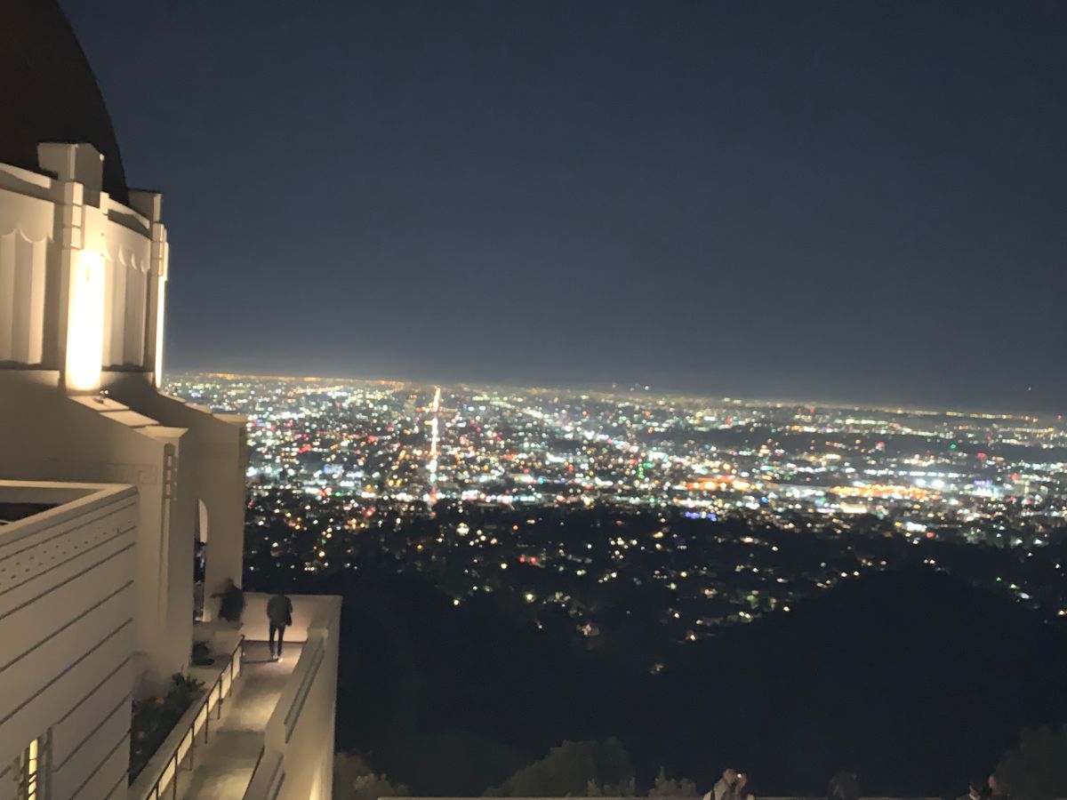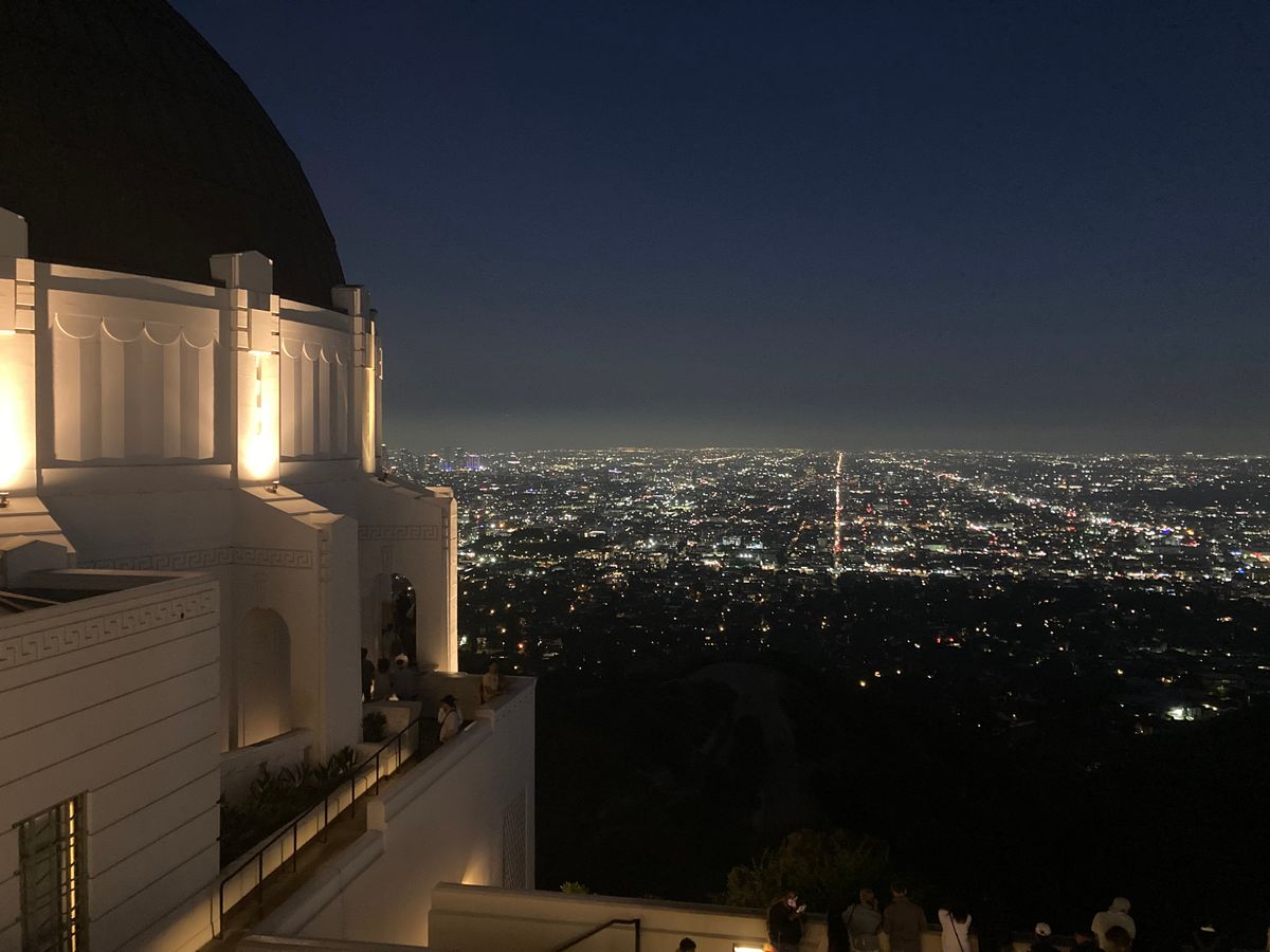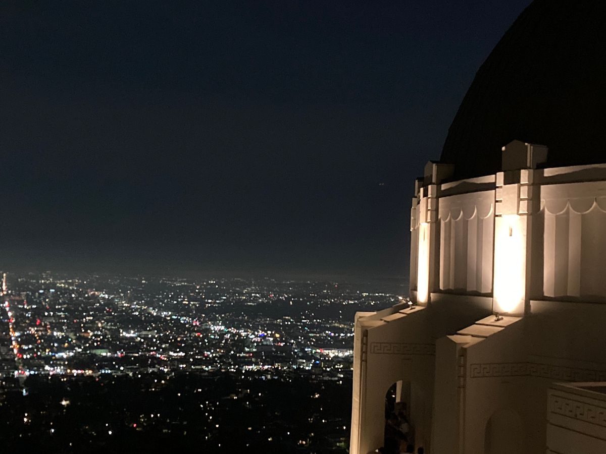 グリフィス天文台からのロサンゼルスの夜景は、とても広くて綺麗で、夢のようでした。天文台の入口前にある、大きな望遠鏡でみた月の表面には驚きました。